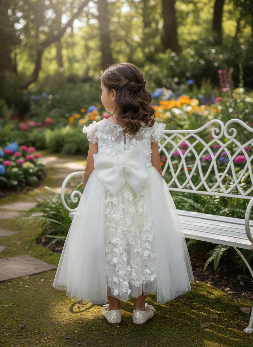 Ρομαντικό βαπτιστικό φόρεμα με ιδιαίτερη γραμμή και παραμυθένια αισθητική. Μπούστο από φίνα δαντέλα με ανάγλυφα κεντήματα και κομψές λεπτομέρειες. Φούστα από πολυεπίπεδο τούλι με αέρινη υφή και εντυπωσιακή δαντελένια ουρά στο πίσω μέρος που χαρίζει κίνηση. Εσωτερική βαμβακερή φόδρα για άνεση και σωστή εφαρμογή. Διακοσμητικό λουλούδι στη μέση που ολοκληρώνει την ρομαντική αισθητική. Χρώμα: Εκρού
