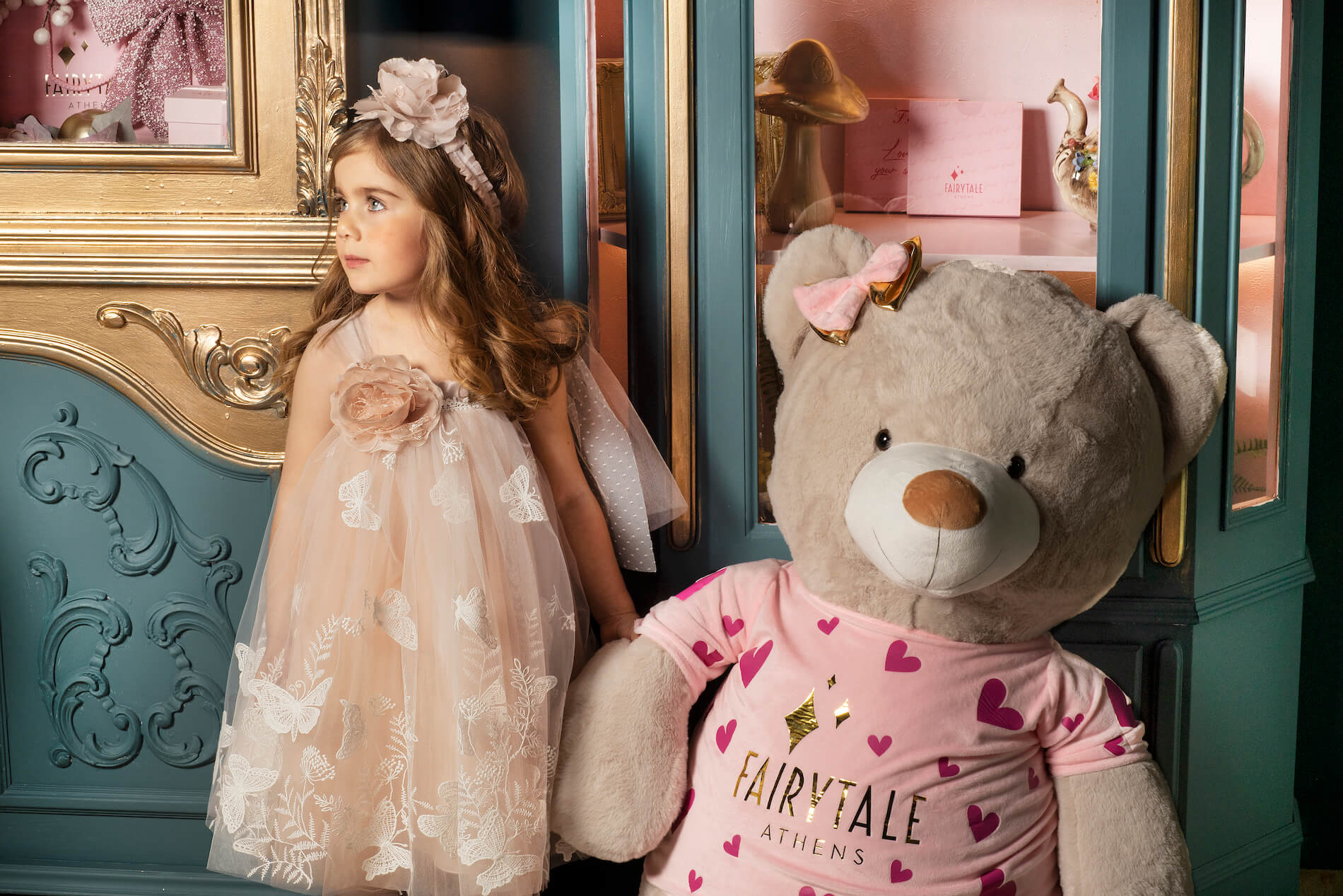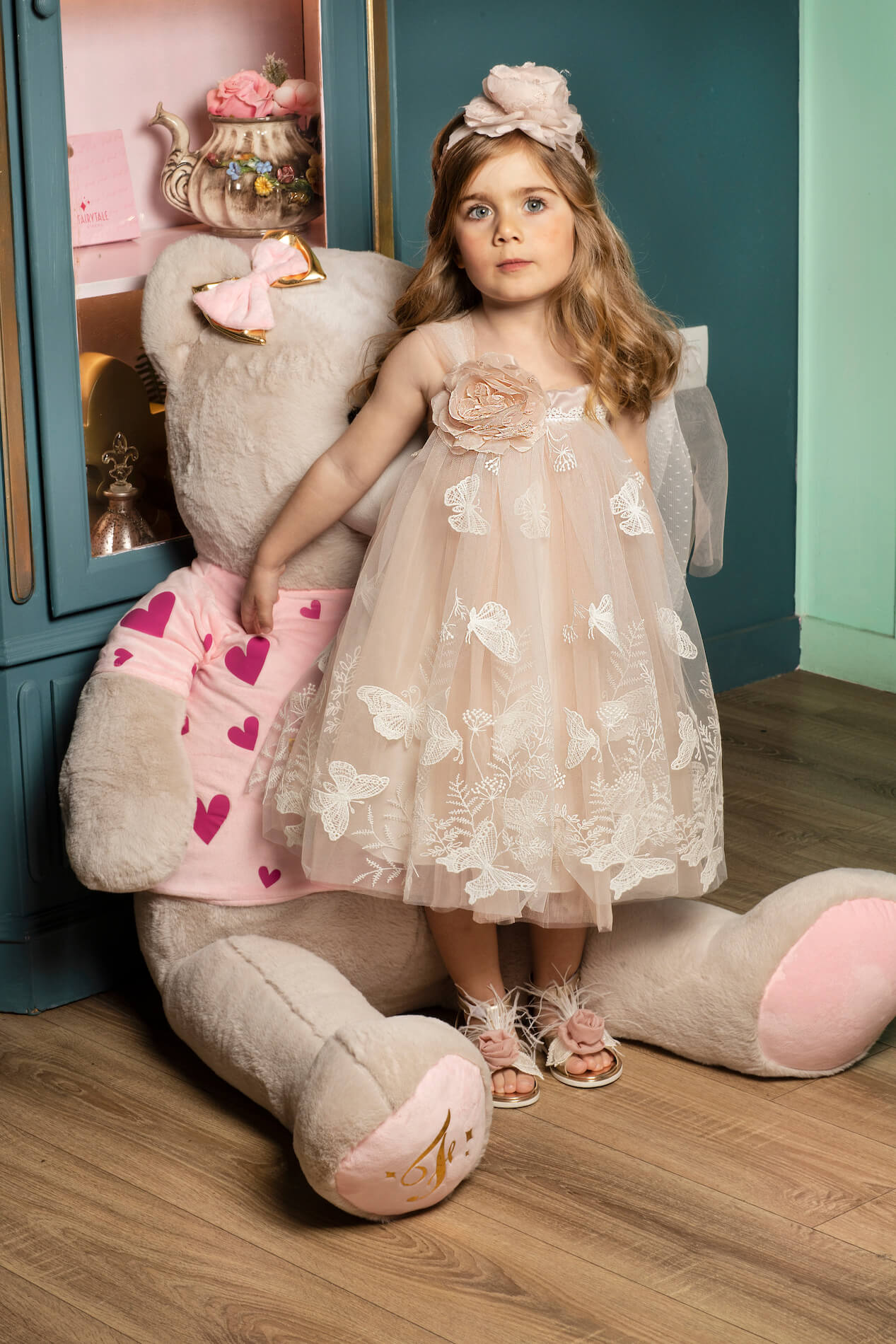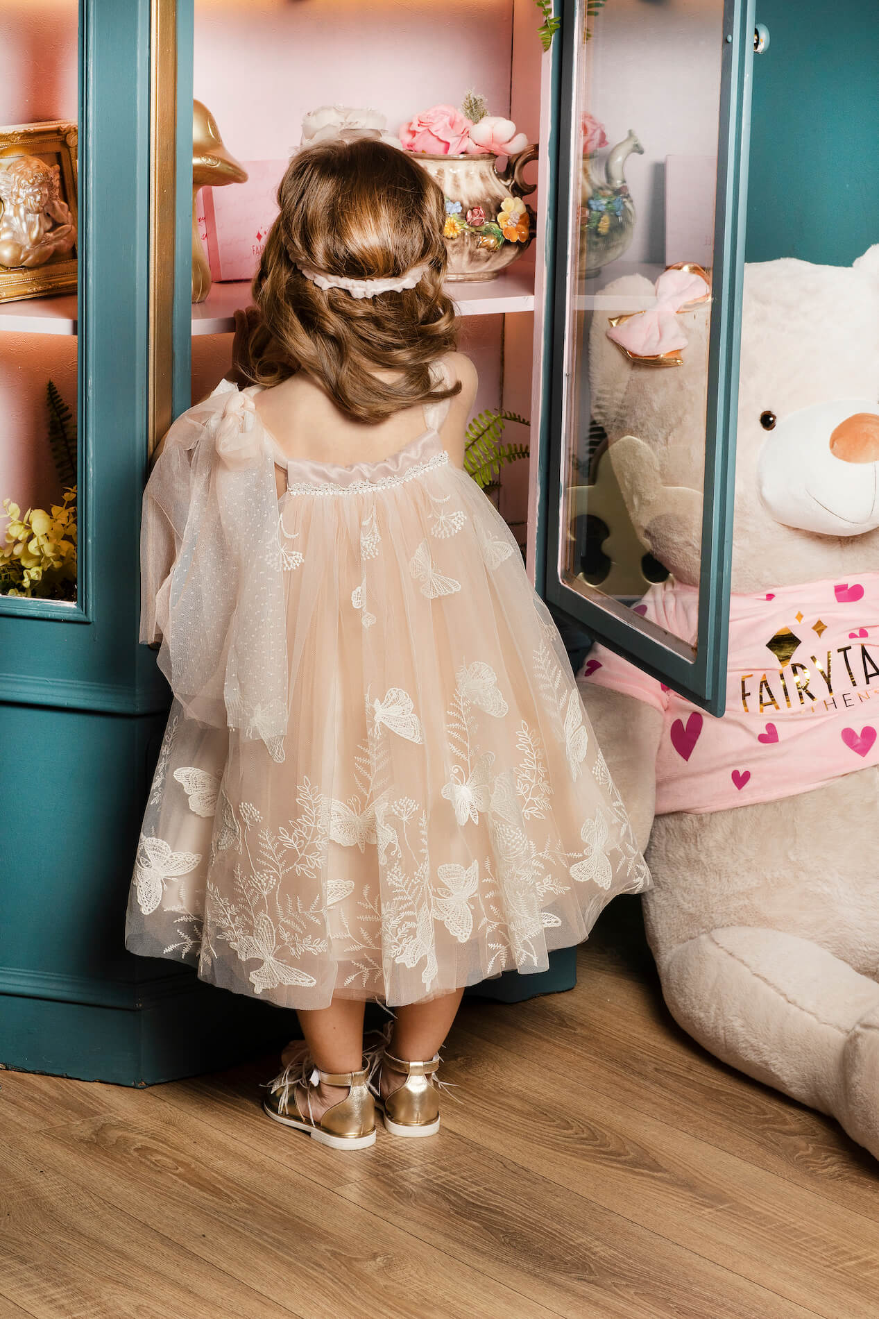 Αέρινο φόρεμα από δαντέλα με κέντημα από πεταλούδες σε γραμμή άλφα. Στο φόρεμα υπάρχει απλικαρισμένο χειροποίητο οργαντινένιο λουλούδι και ένας τούλινος φίογκος στον ώμο . Το εσωτερικό είναι επενδυμένο με 100% βαμβακερή φόδρα.