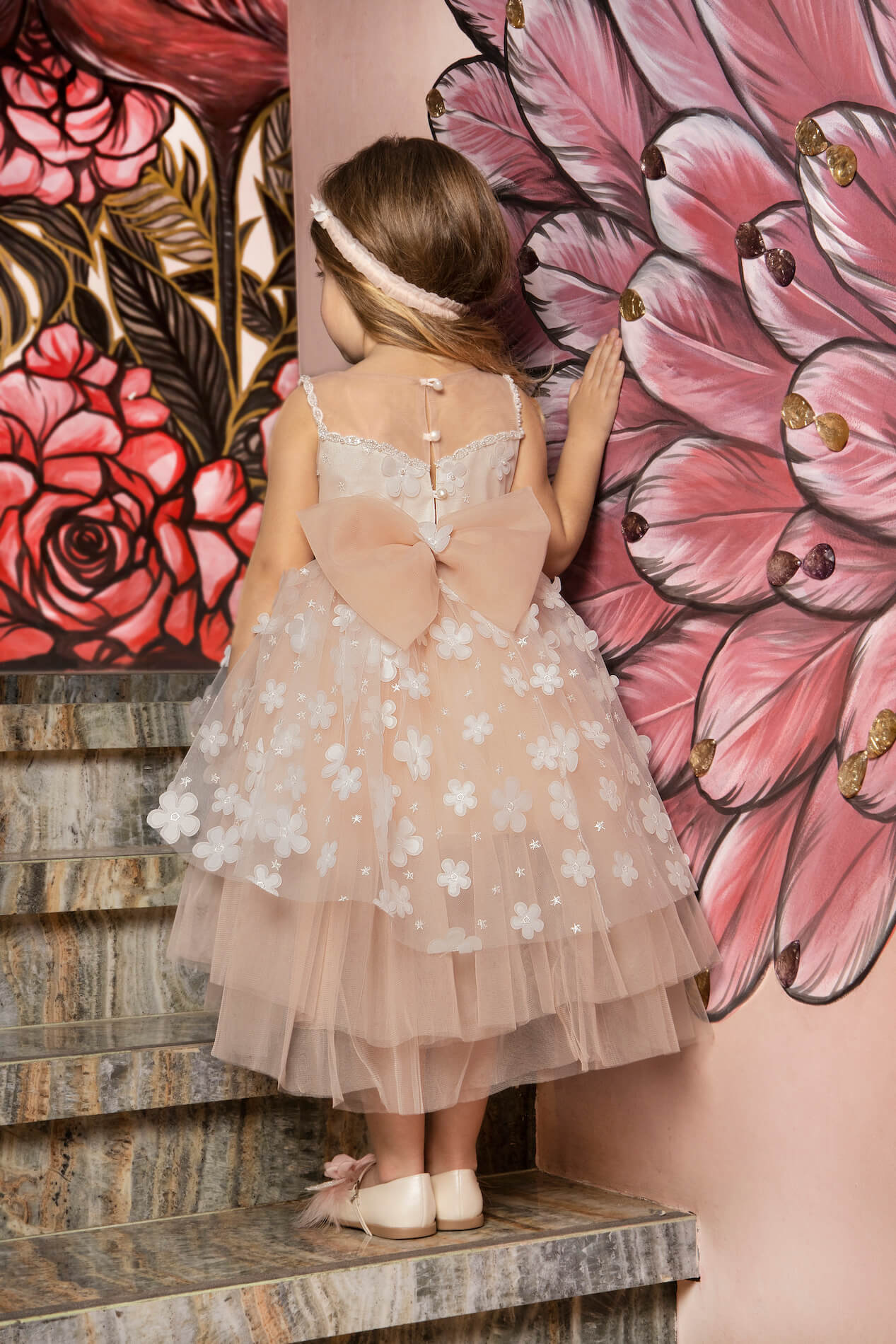 Ρομαντικό ασύμετρο φόρεμα από τρισδιάστατη δαντέλα με λουλούδια. Το πάνω μέρος του φορέματος έχει κεντηθεί με πέρλες και παγιέτες δίνοντας μια εκλεπτυσμένη αίσθηση στο σύνολο της μικρής σας. Εσωτερικά είναι επενδεδυμένο με φόδρα 100% βαμβακερή