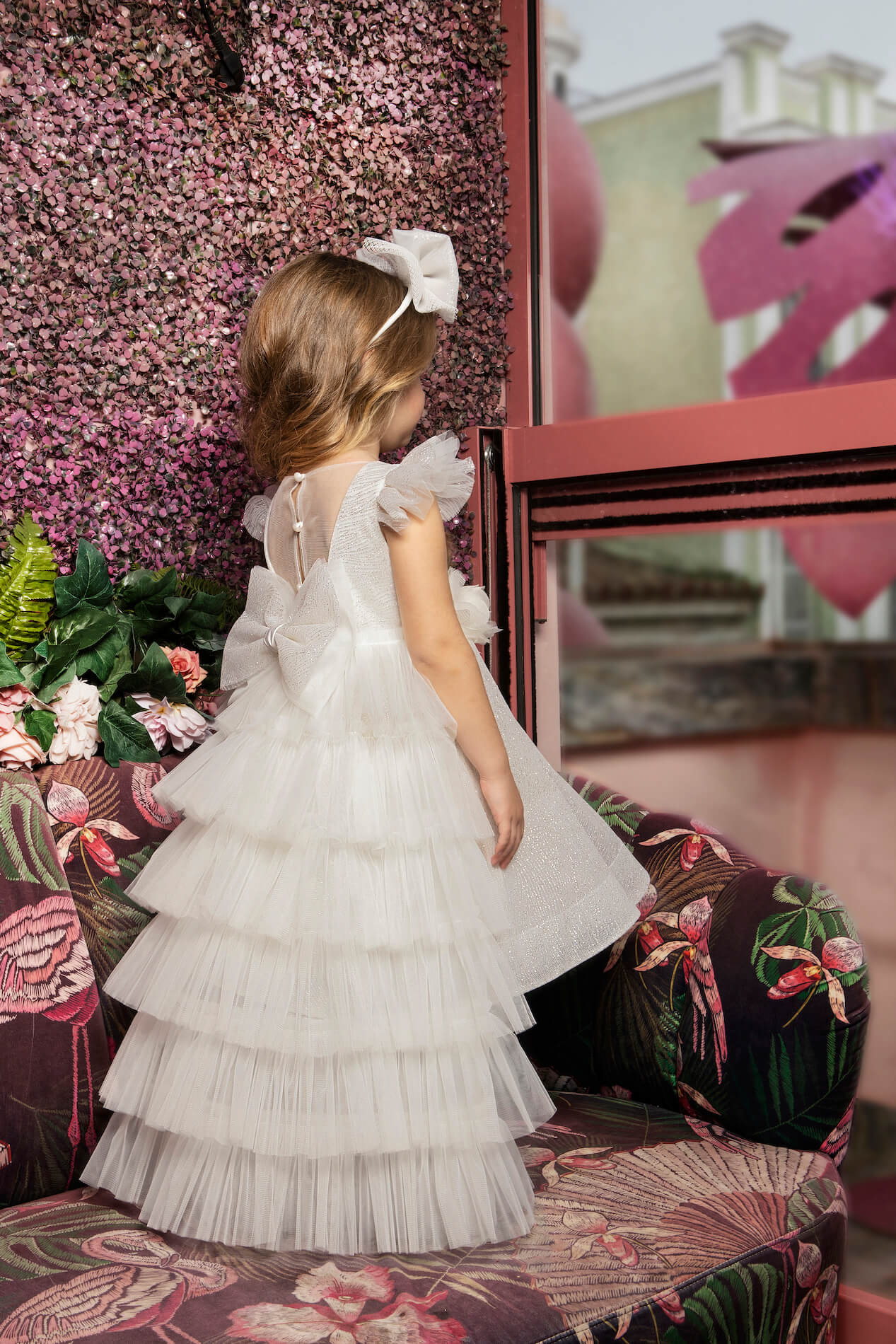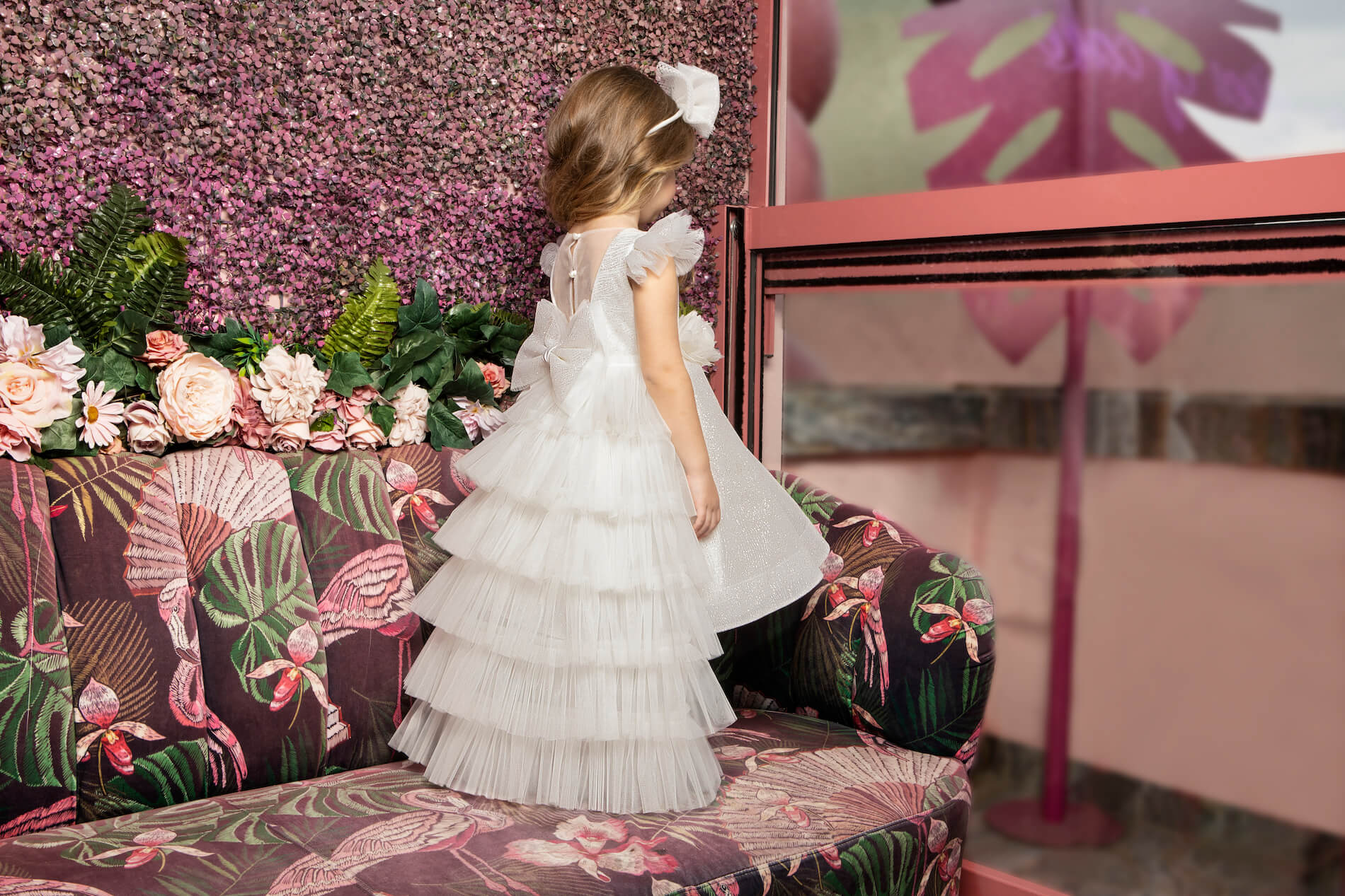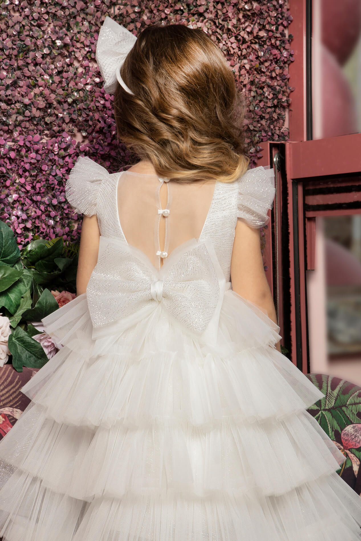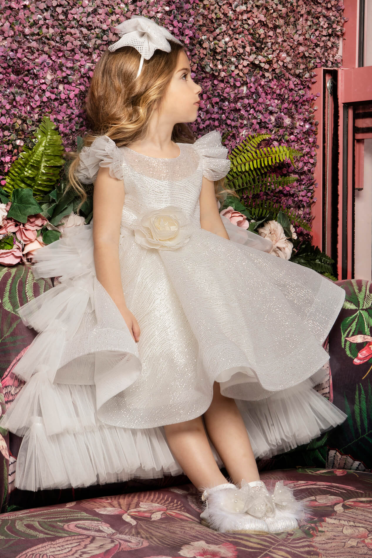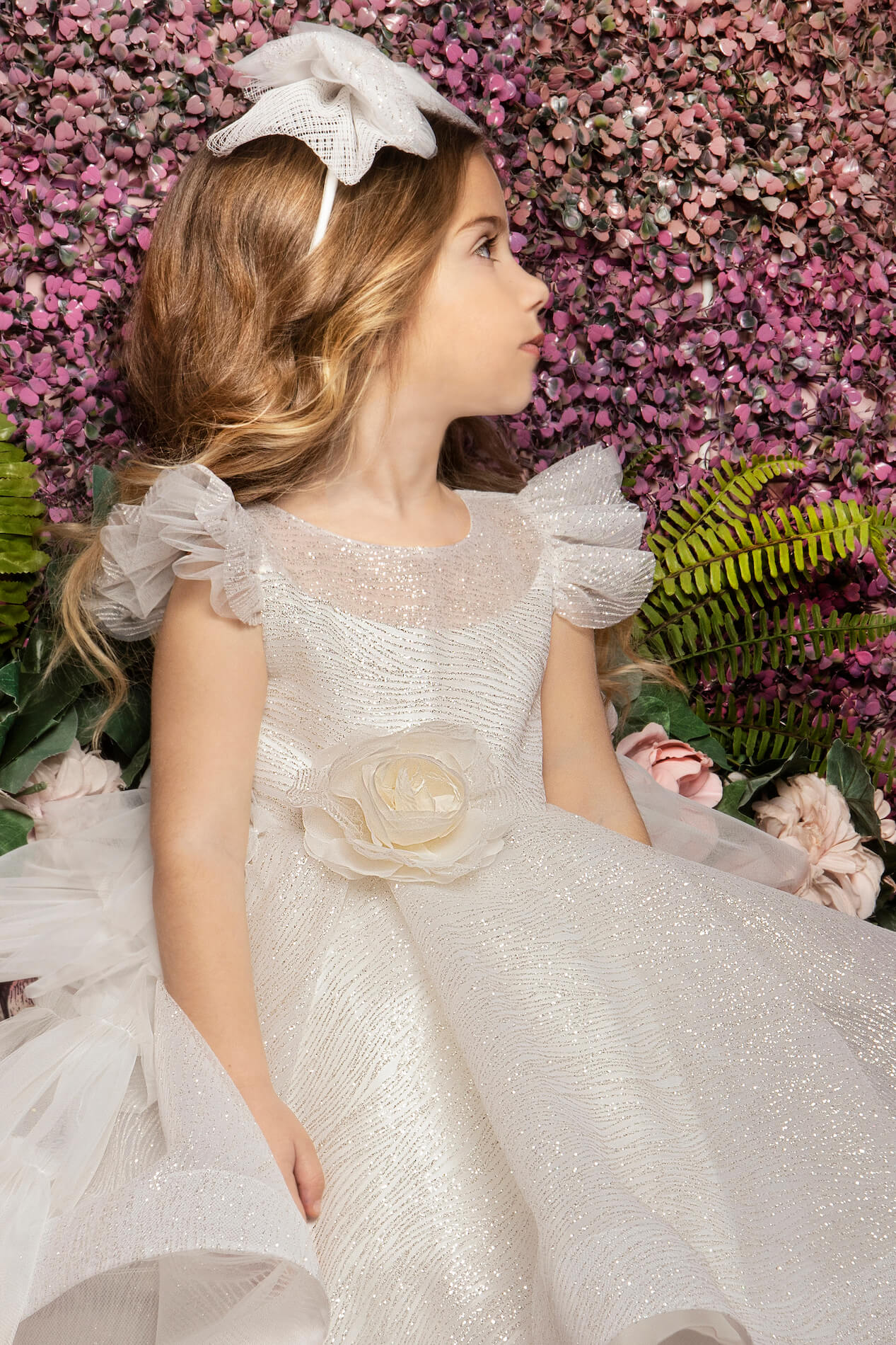 Εντυπωσιακό φόρεμα από γκλίτερ τούλι με μανίκι. Στο φόρεμα υπάρχει απλικαρισμένο χειροποίητο οργαντινένιο λουλούδι και στο πίσω μέρος μία αποσπώμενη μακριά ουρά με βολάν από τούλι. Ένα φόρεμα υψηλής ραπτικής και ειδικών περιστάσεων. Εσωτερικά είναι επενδυμένο με 100% βαμβακερή φόδρα.
