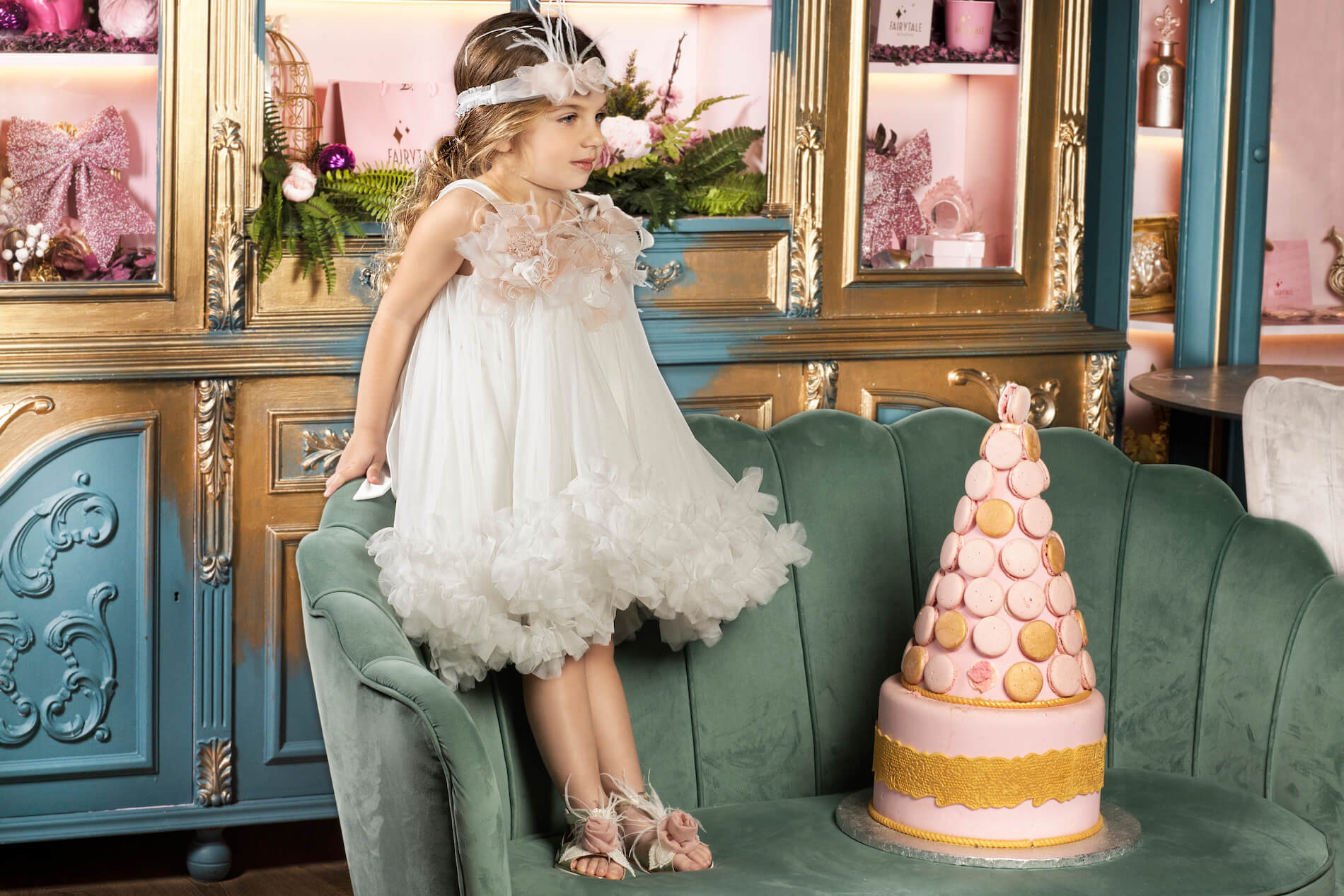 Ιδιαίτερο φόρεμα με μανίκι από εξαιρετικής ποιότητας τούλι σε γραμμή άλφα. Το μήκος του είναι άνισο και τα ιδιαίτερα βολάν του δίνουν μια εκλεπτυσμένη αίσθηση. Διακοσμημένο στο πάνω μέρος με διάφορα χειροποίητα λουλούδια σε απόχρωση ιβουάρ, σάπιο μήλο και γκλίτερ. Είναι ένα φόρεμα ειδικά σχεδιασμένο για εντυπωσιακές εμφανίσεις. Επενδυμένο εσωτερικά με 100% βαμβακερή φόδρα.