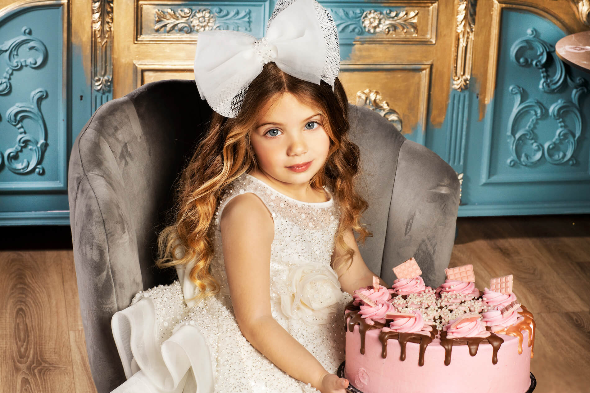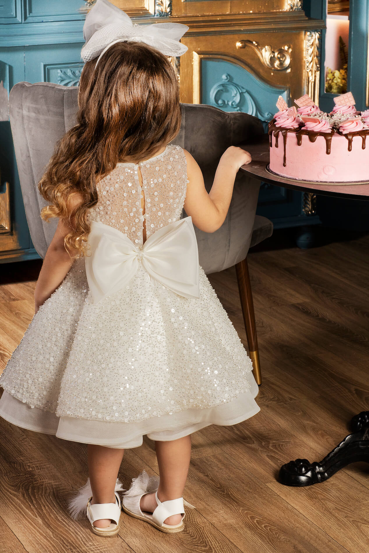 Εντυπωσιακό φόρεμα από εξαιρετικής ποιότητας δαντέλα με παγιέτες και πέρλες, με πτυχές που δημιουργεί πριγκιπική αίσθηση. Στη μέση του φορέματος υπάρχει ένα χειροποίητο οργαντινένιο λουλούδι. Στο πίσω μέρος του φορέματος ο διπλός φιόγκος, ολοκληρώνει την αριστοκρατική όψη του φορέματος. Ιδανικό για τις πιο ξεχωριστές εμφανίσεις της μικρής σας πριγκίπισσας