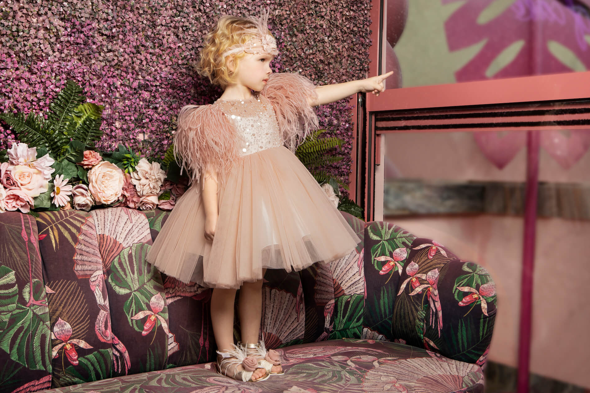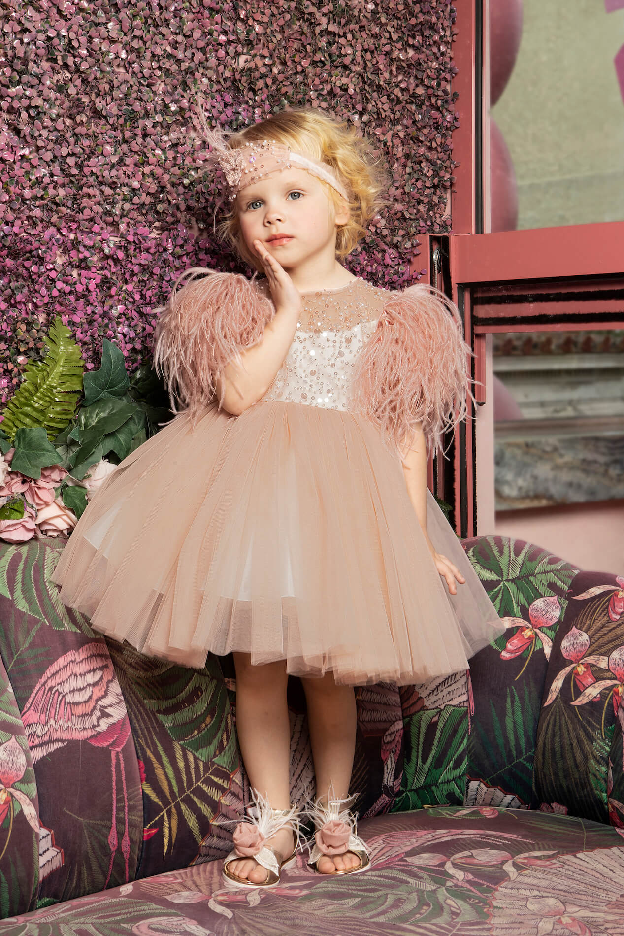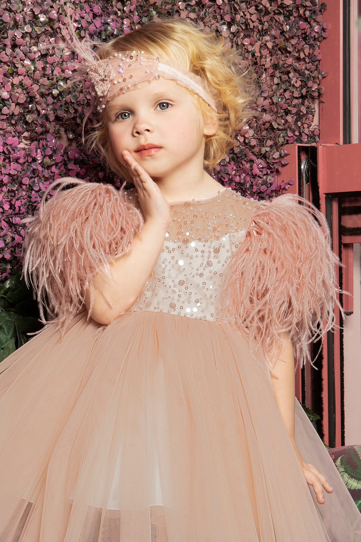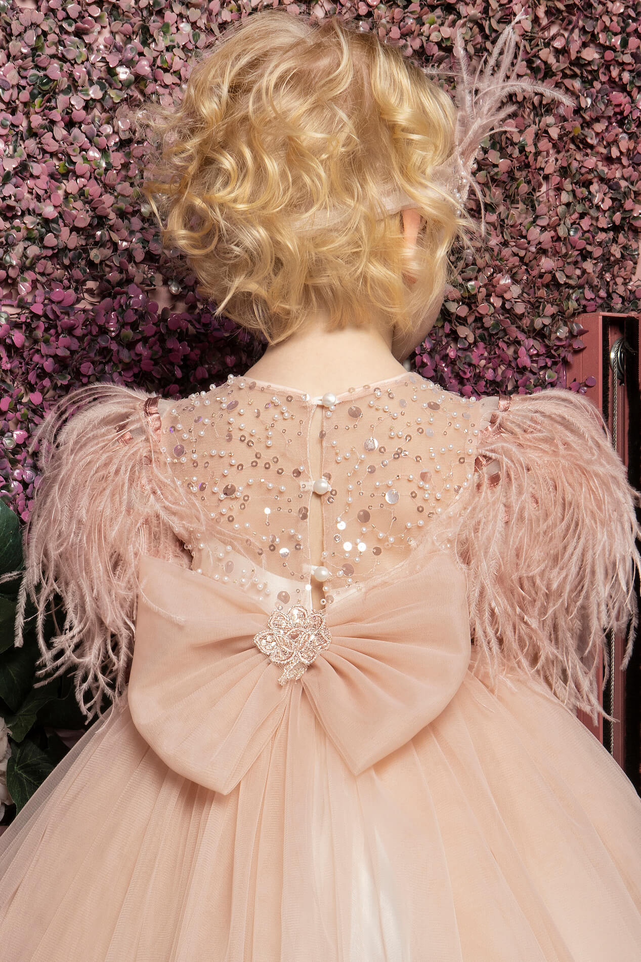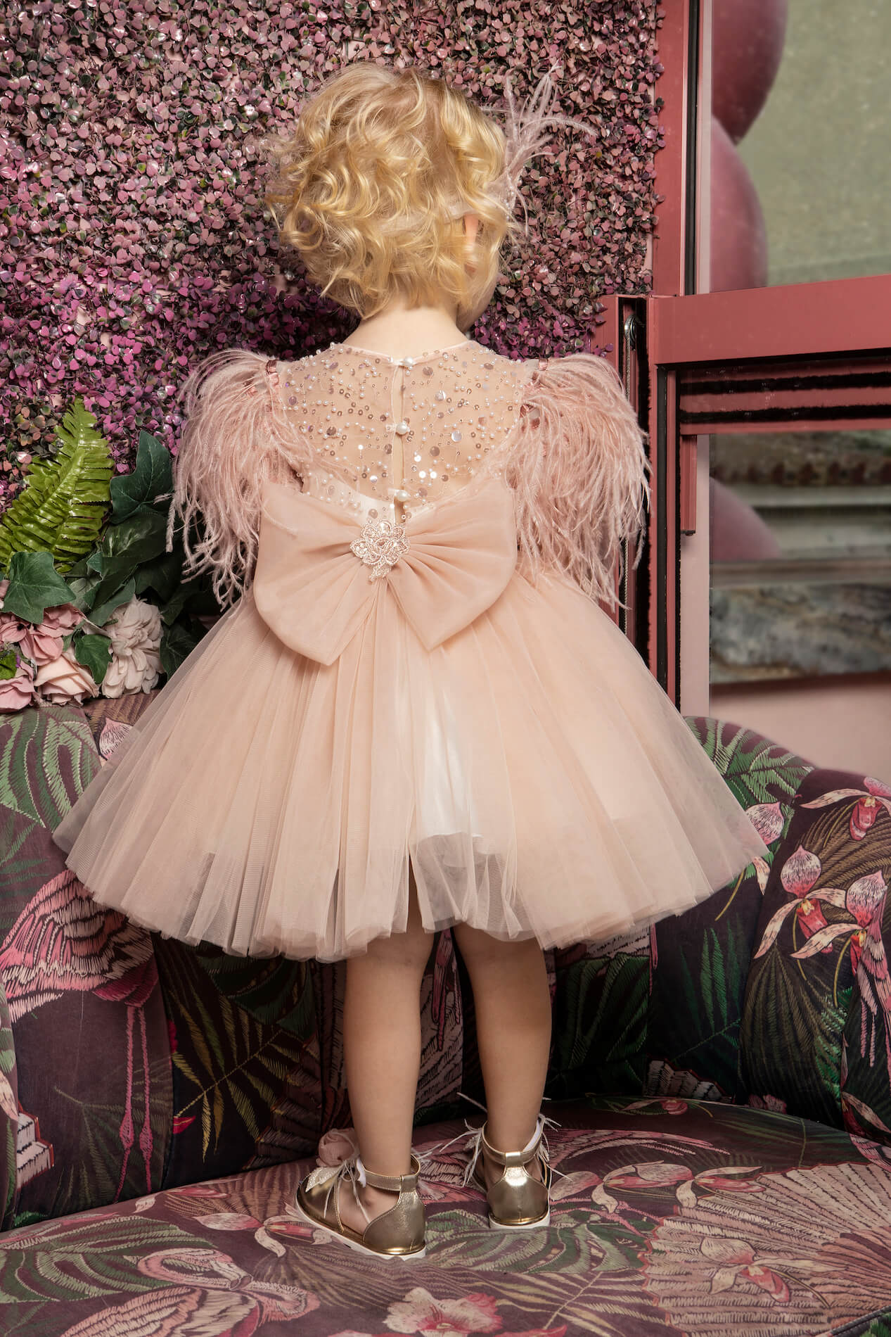 Κομψό ιβουάρ φόρεμα από δαντέλα με παγιέτες και πέρλες και μανίκι διακοσμημένο με πούπουλα. Η δαντέλα και το πούπουλο, προσδίδουν αίσθηση υψηλής ραπτικής στην εμφάνιση της μικρής σας πριγκίπισσας . Το φόρεμα ολοκληρώνετε με έναν τούλινο φιόγκο στο πίσω μέρος. Το εσωτερικό είναι επενδυμένο με 100% βαμβακερή φόδρα.