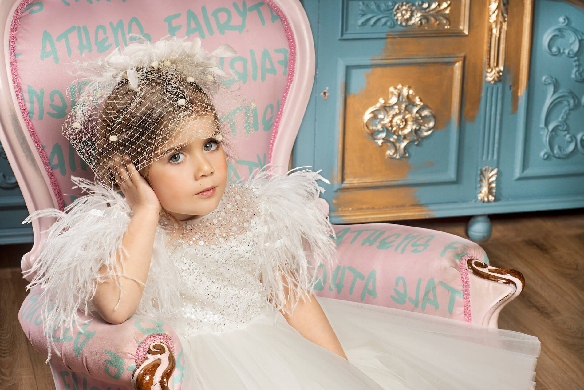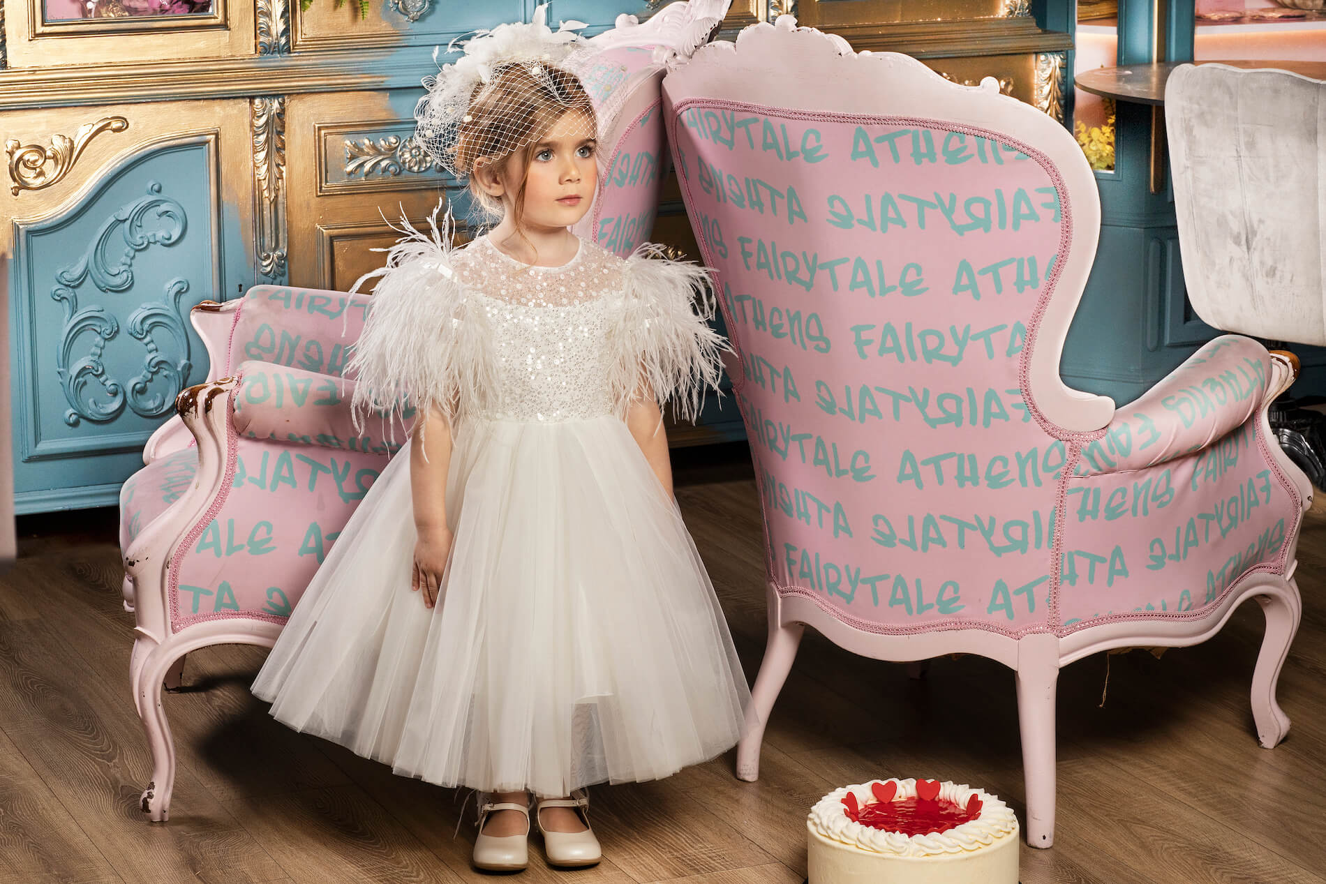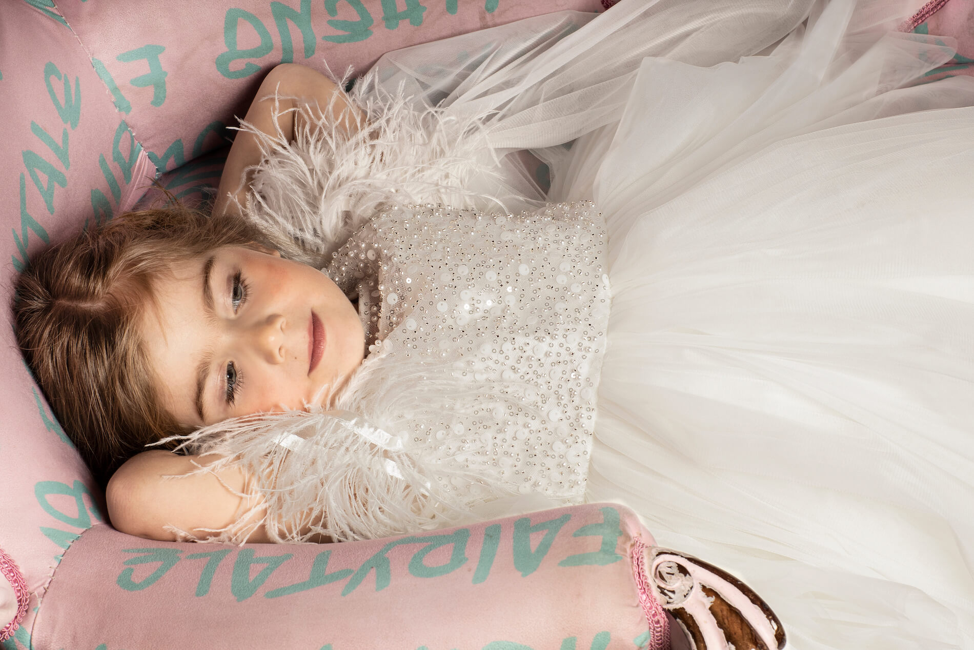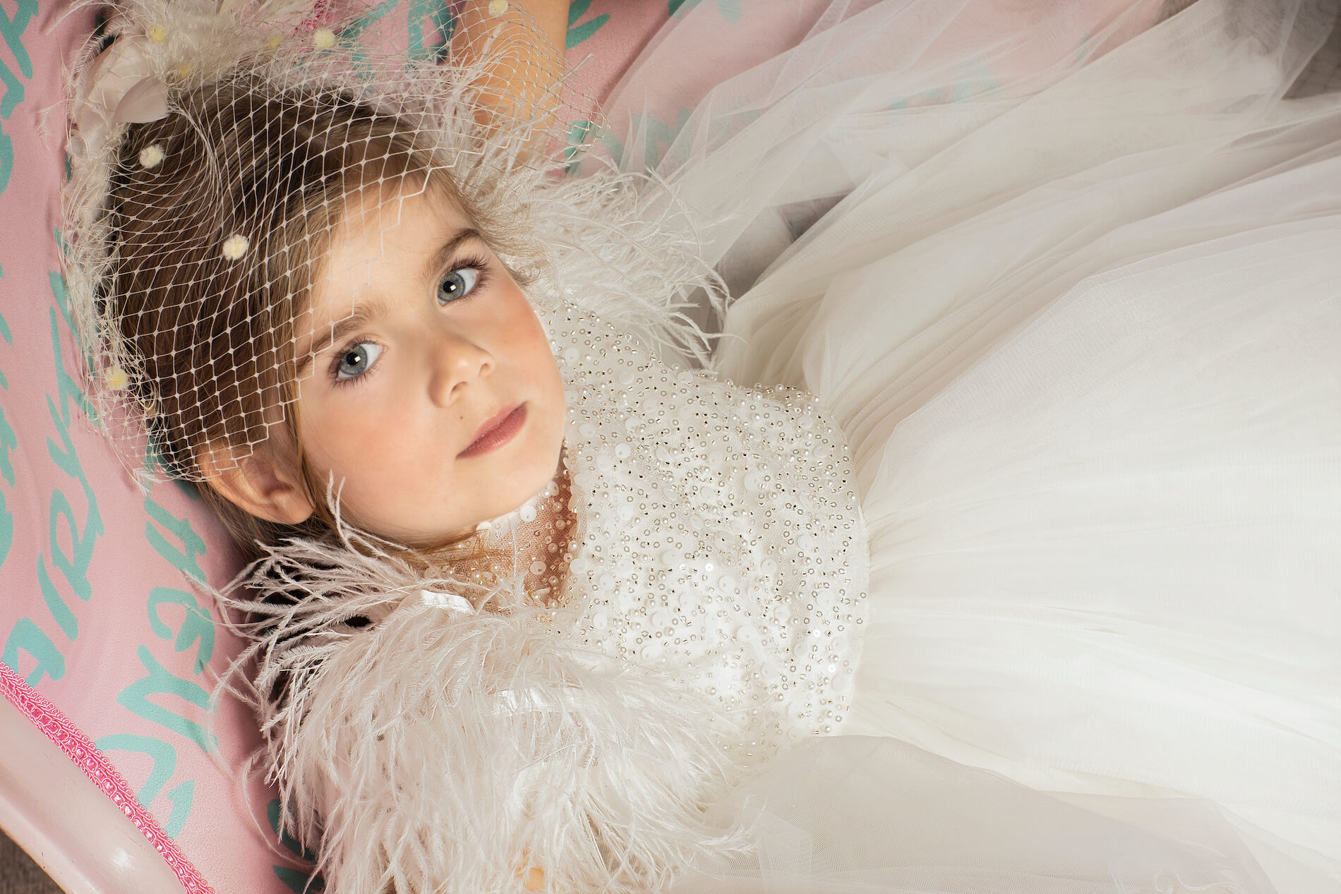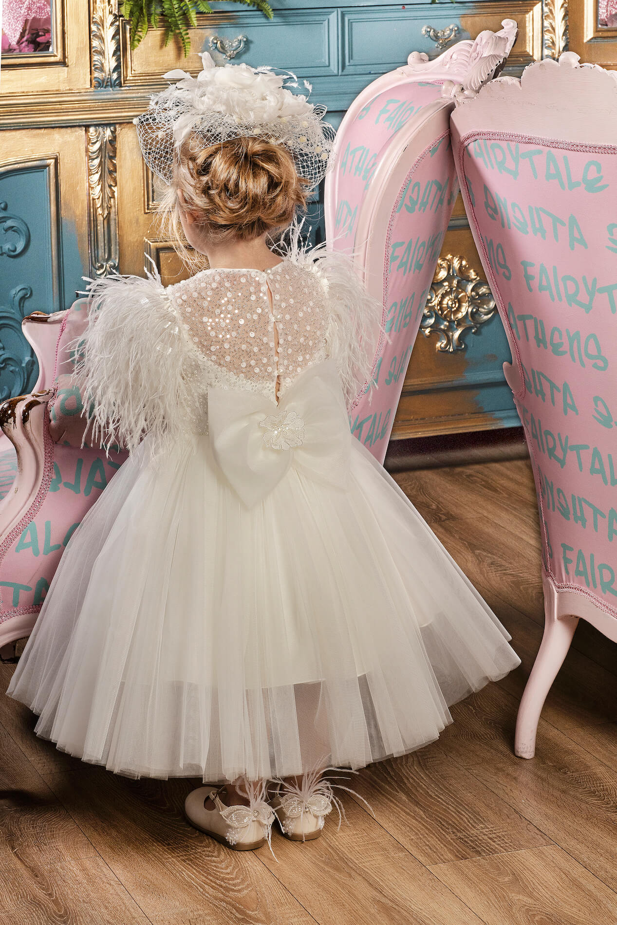 Κομψό ιβουάρ φόρεμα από δαντέλα με παγιέτες και πέρλες και μανίκι διακοσμημένο με πούπουλα. Η δαντέλα και το πούπουλο, προσδίδουν αίσθηση υψηλής ραπτικής στην εμφάνιση της μικρής σας πριγκίπισσας . Το φόρεμα ολοκληρώνετε με έναν τούλινο φιόγκο στο πίσω μέρος. Το εσωτερικό είναι επενδυμένο με 100% βαμβακερή φόδρα.