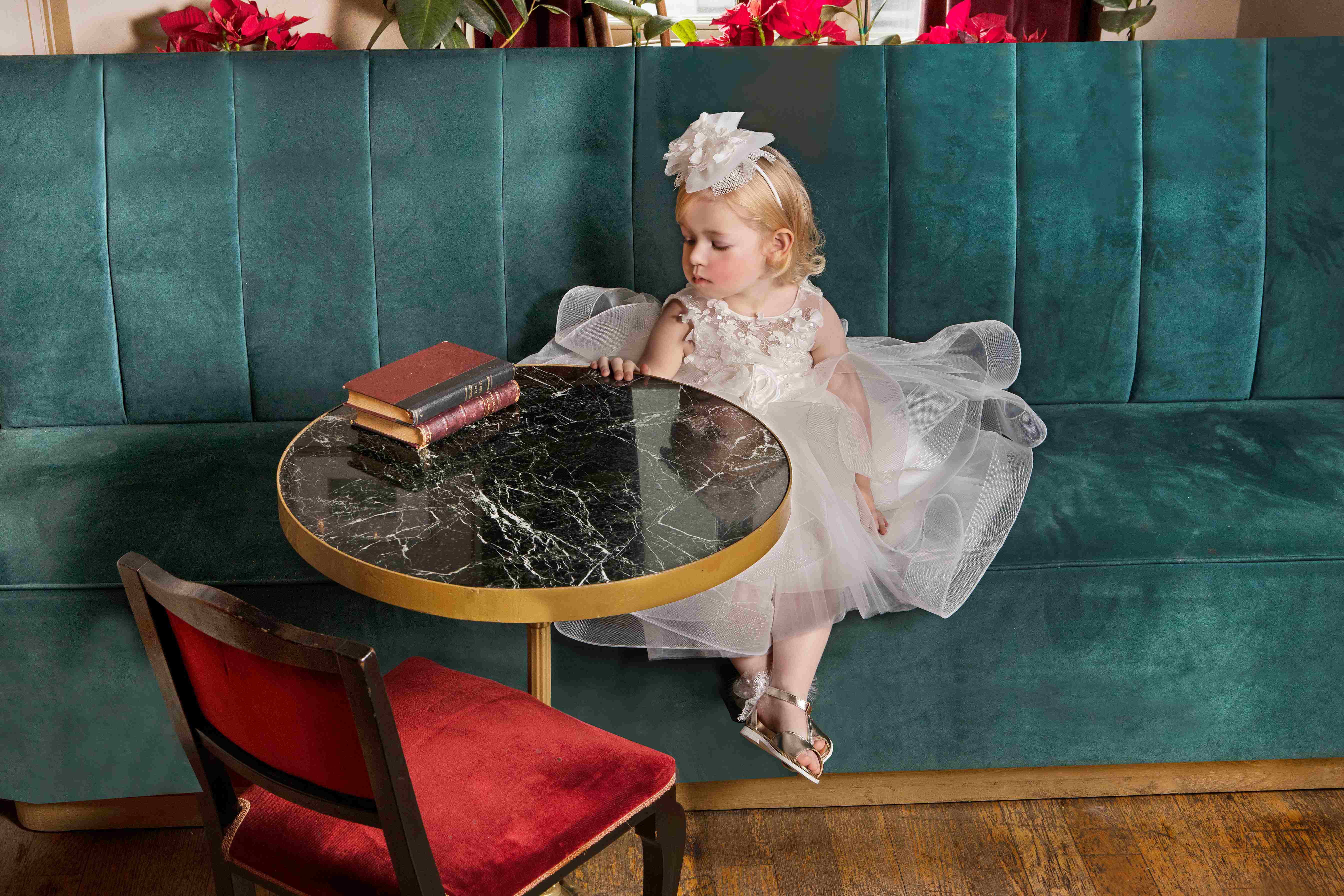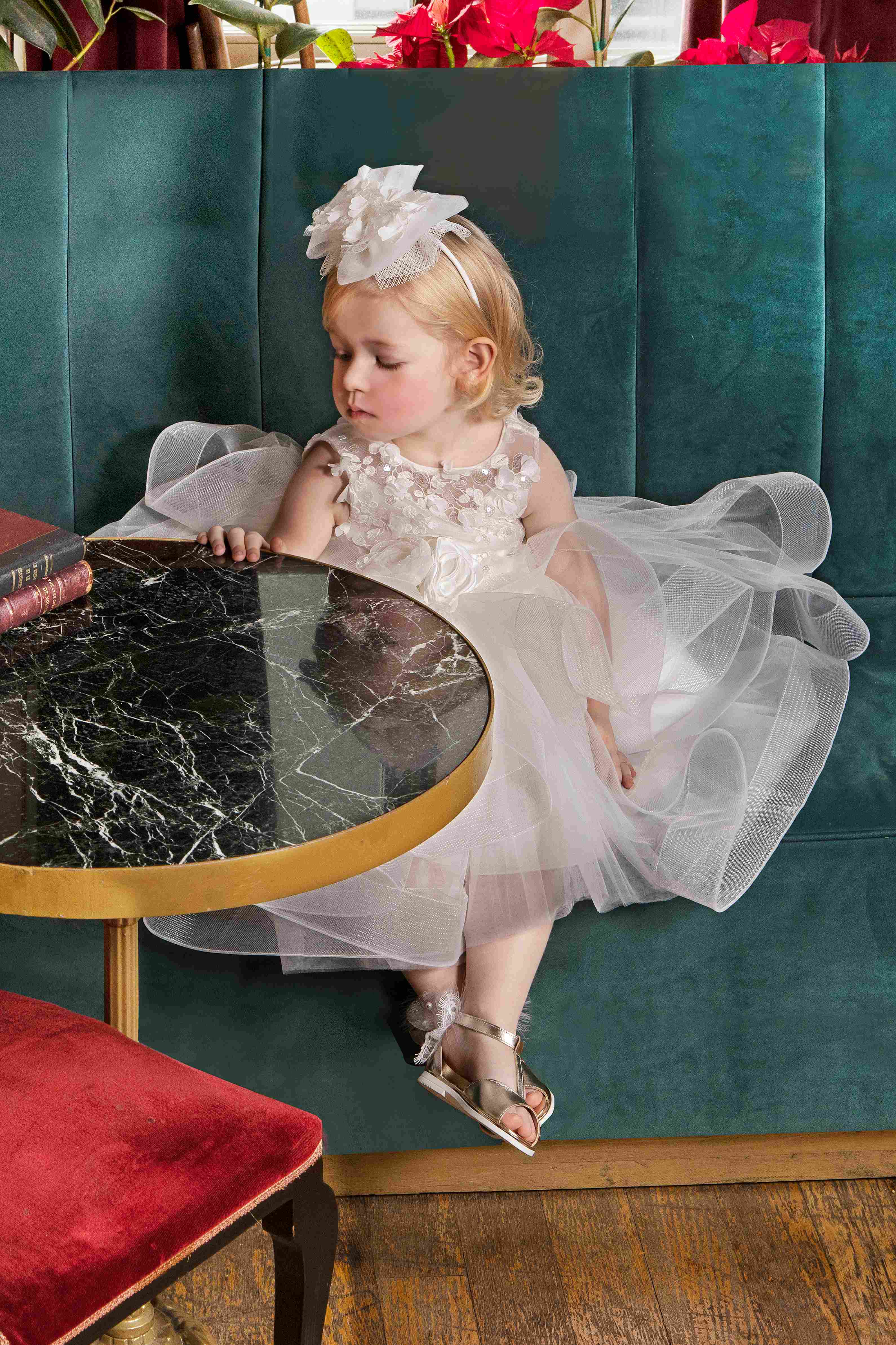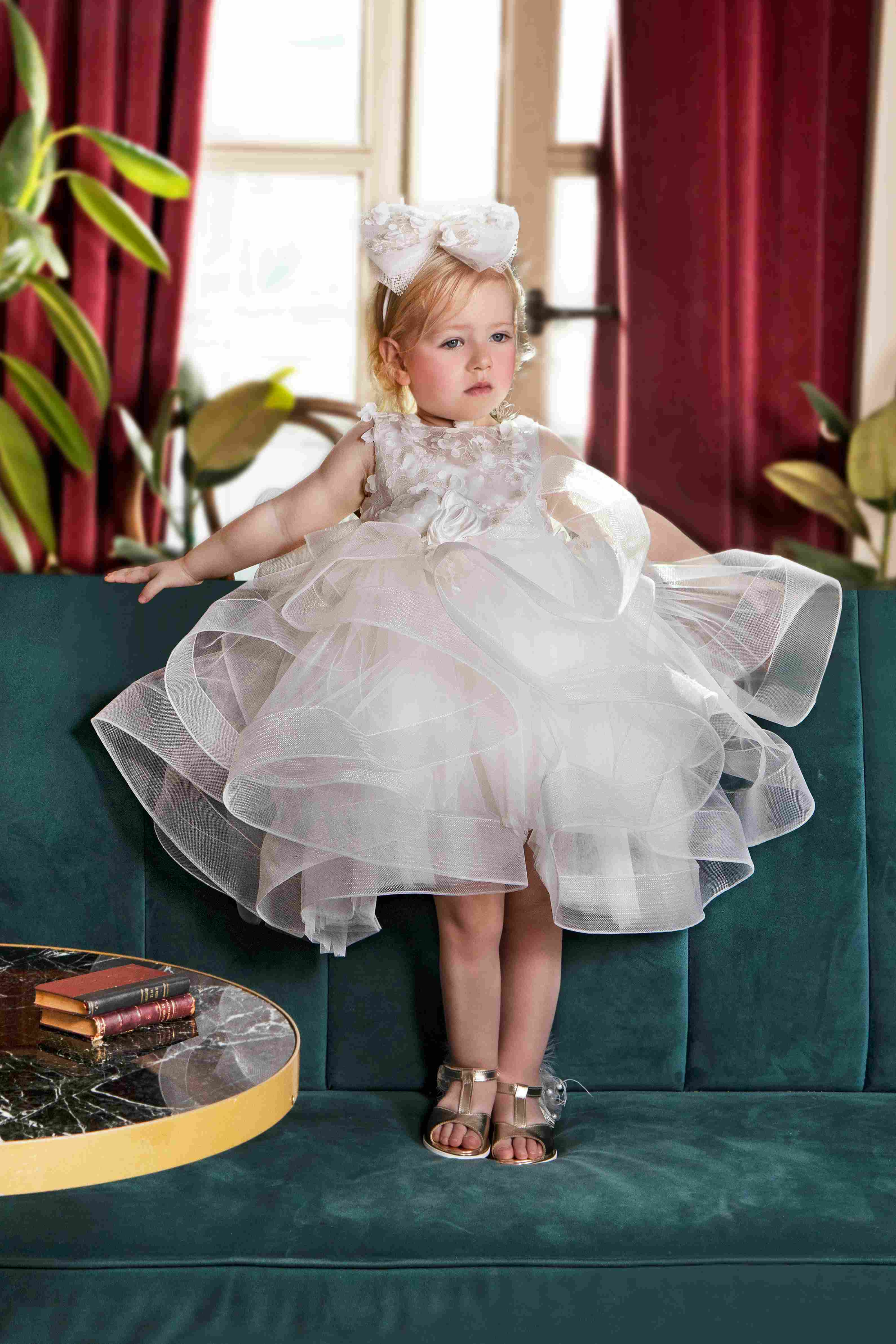 Μεγάλος δαντελένιος φιόγκος στα μαλλιά, που ολοκληρώνει τη βασιλική εμφάνιση.