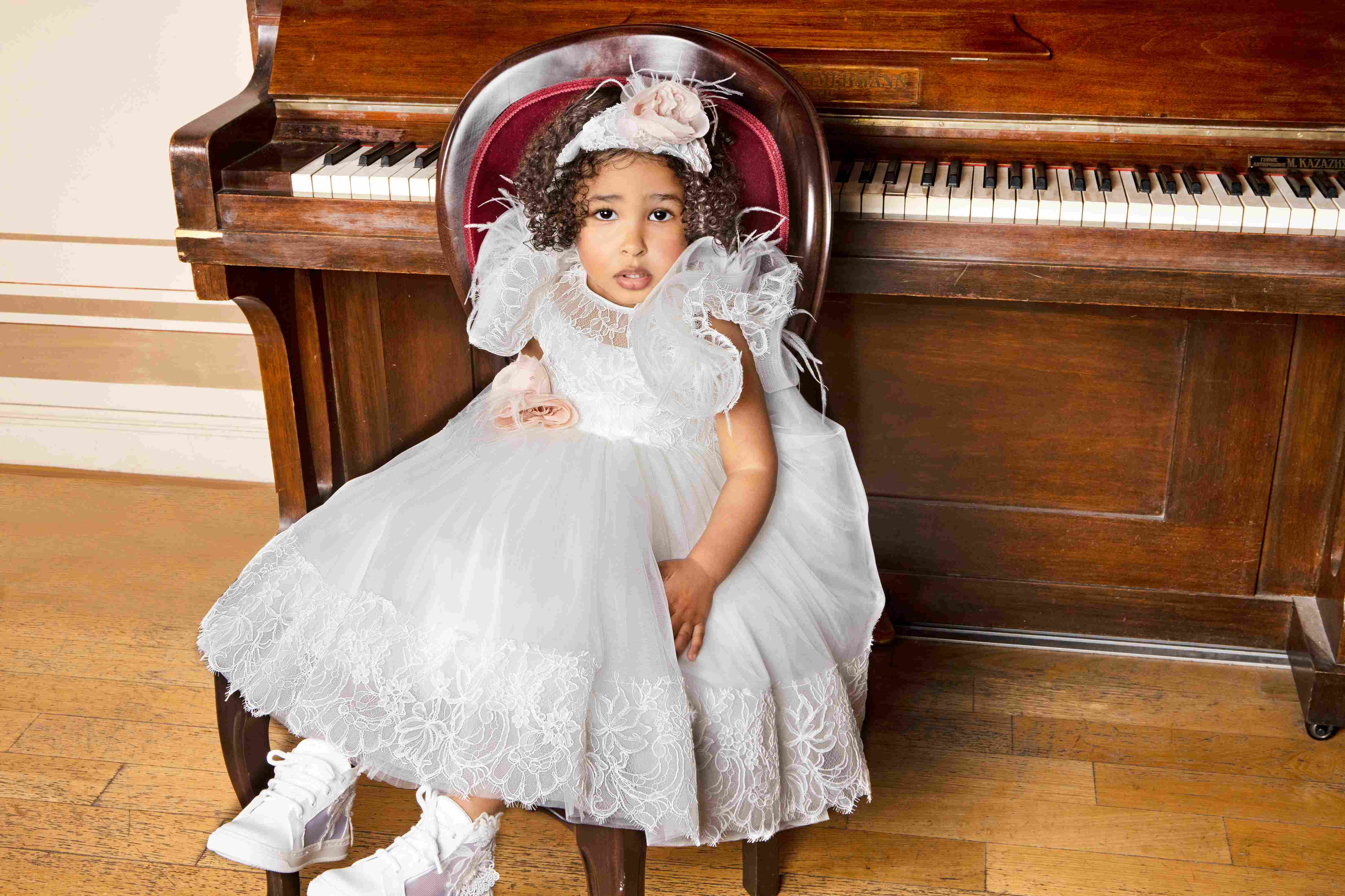 Σατέν λουλούδι στη μέση & ασορτί στεφανάκι, ολοκληρώνοντας την εμφάνιση με ρομαντική λεπτομέρεια.