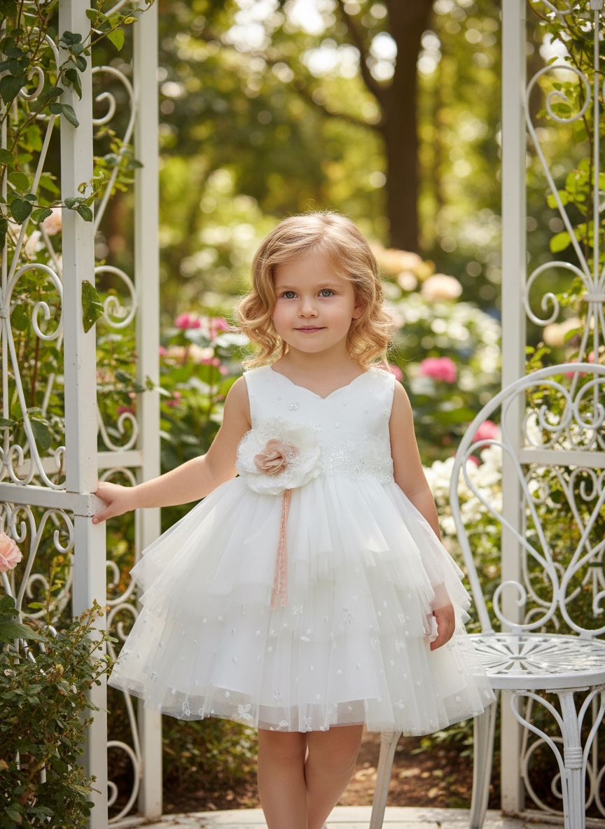 Ρομαντικό βαπτιστικό φόρεμα με girly χαρακτήρα και παραμυθένια διάθεση. Μπούστο από φίνα δαντέλα με διακριτικά κεντήματα και λαμπερές λεπτομέρειες. Φούστα από πολυεπίπεδο τούλι με ανάλαφρη υφή και αέρινη κίνηση. Εσωτερική βαμβακερή φόδρα για άνεση και σωστή εφαρμογή. Εντυπωσιακό διακοσμητικό λουλούδι στη μέση με ρομαντικές κορδέλες που ολοκληρώνουν το σχέδιο. Χρώμα:Εκρού