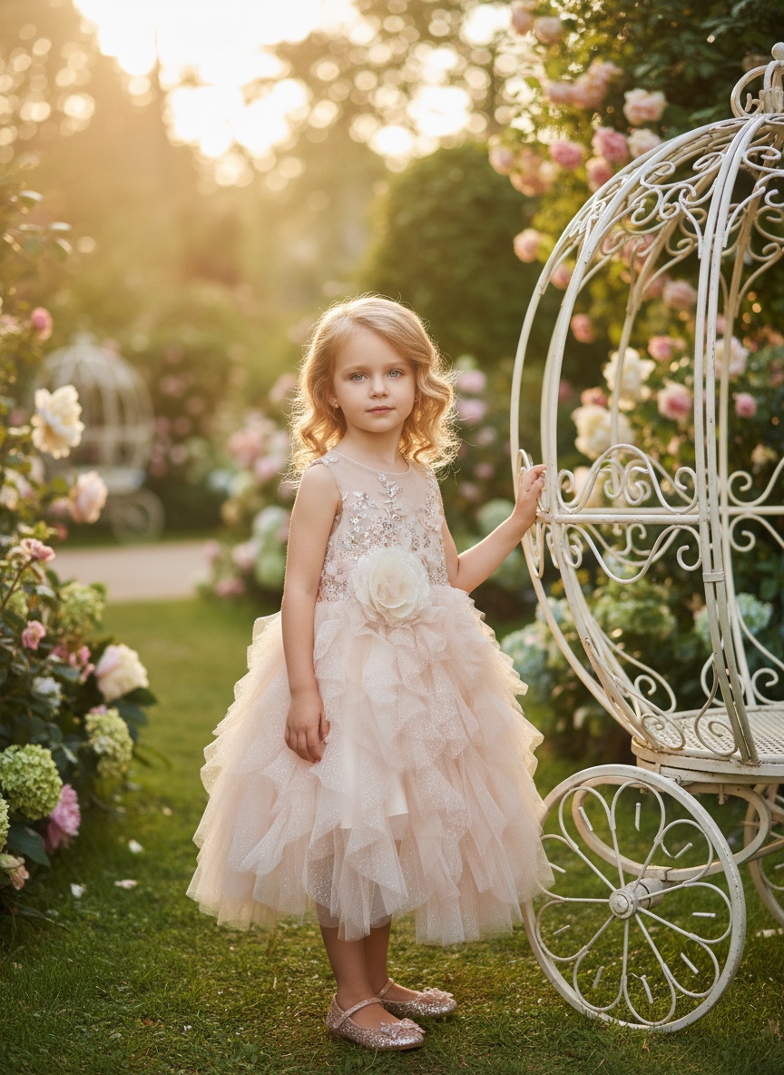 Εντυπωσιακό βαπτιστικό φόρεμα με glamorous διάθεση και παραμυθένια αισθητική. Μπούστο με πλούσια κεντήματα και διακριτικές παγιέτες που χαρίζουν λάμψη και πολυτελή υφή. Φούστα από πολυεπίπεδο τούλι με έντονο όγκο και θεατρική κίνηση. Εσωτερική βαμβακερή φόδρα για άνεση και σωστή εφαρμογή. Εντυπωσιακό τρισδιάστατο λουλούδι στη μέση που ολοκληρώνει τη ρομαντική αισθητική. Χρώμα: Nude