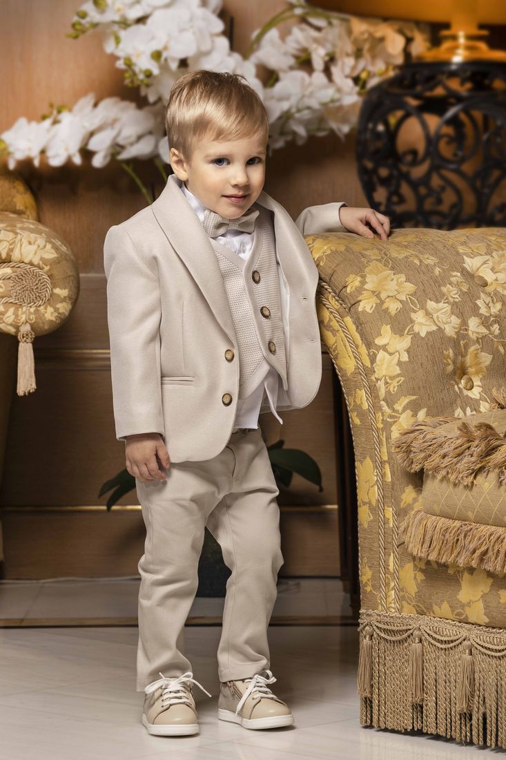 Κομψό και εντυπωσιακό σύνολο που αποτελείται από εξαιρετικής ποιότητας 100% βαμβακερό λευκό ριγέ πουκάμισο. Το σετ δίνει έμφαση στην φινέτσα με το μπεζ βαμβακερό/πολυέστερ παντελόνι και την υψηλή αισθητική του μπεζ γιλέκου, κάνοντας κάθε εμφάνιση του μικρού σας ξεχωριστή.