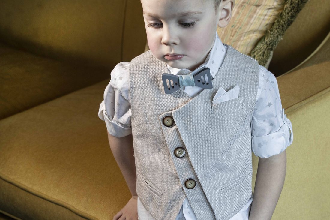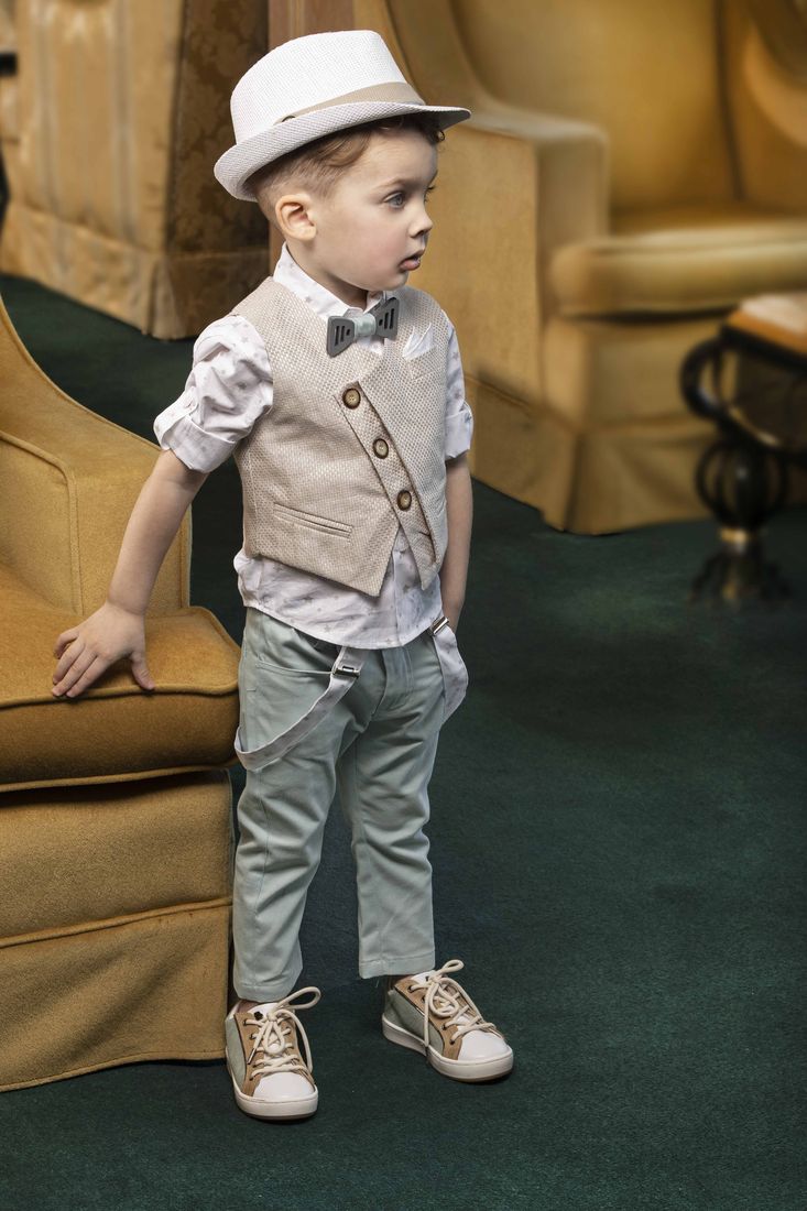 Κομψό σύνολο για μοναδικές εμφανίσεις. Το σύνολο αποτελείται από βαμβακερό πουκάμισο σε λευκό χρώμα με μπεζ αστέρια και είναι άρτια συνδυασμένο με μέντα βαμβακερό παντελόνι και γιλέκο λινό σε απόχρωση μπεζ.