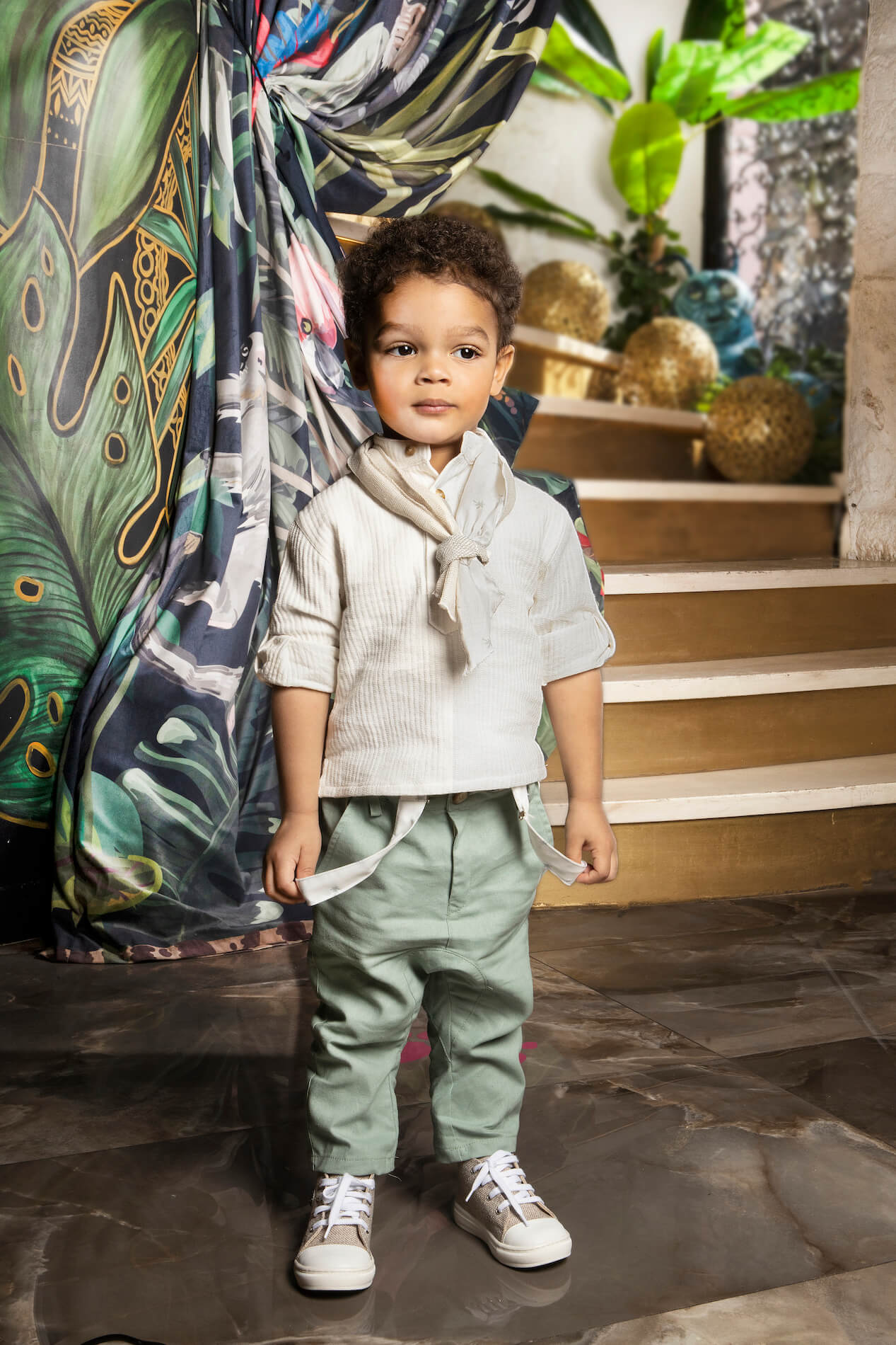 Το σύνολο αποτελείται από εκρού ριγέ βαμβακερή πουκαμίσα και ολοκληρώνεται με λινό/βαμβάκι μέντα παντελόνι σε στυλ σαλβάρι. Πρόκειται για ένα ανάλαφρο σετ που θα φορέσει ο μικρός σας στις πιο ξεχωριστές του στιγμές.