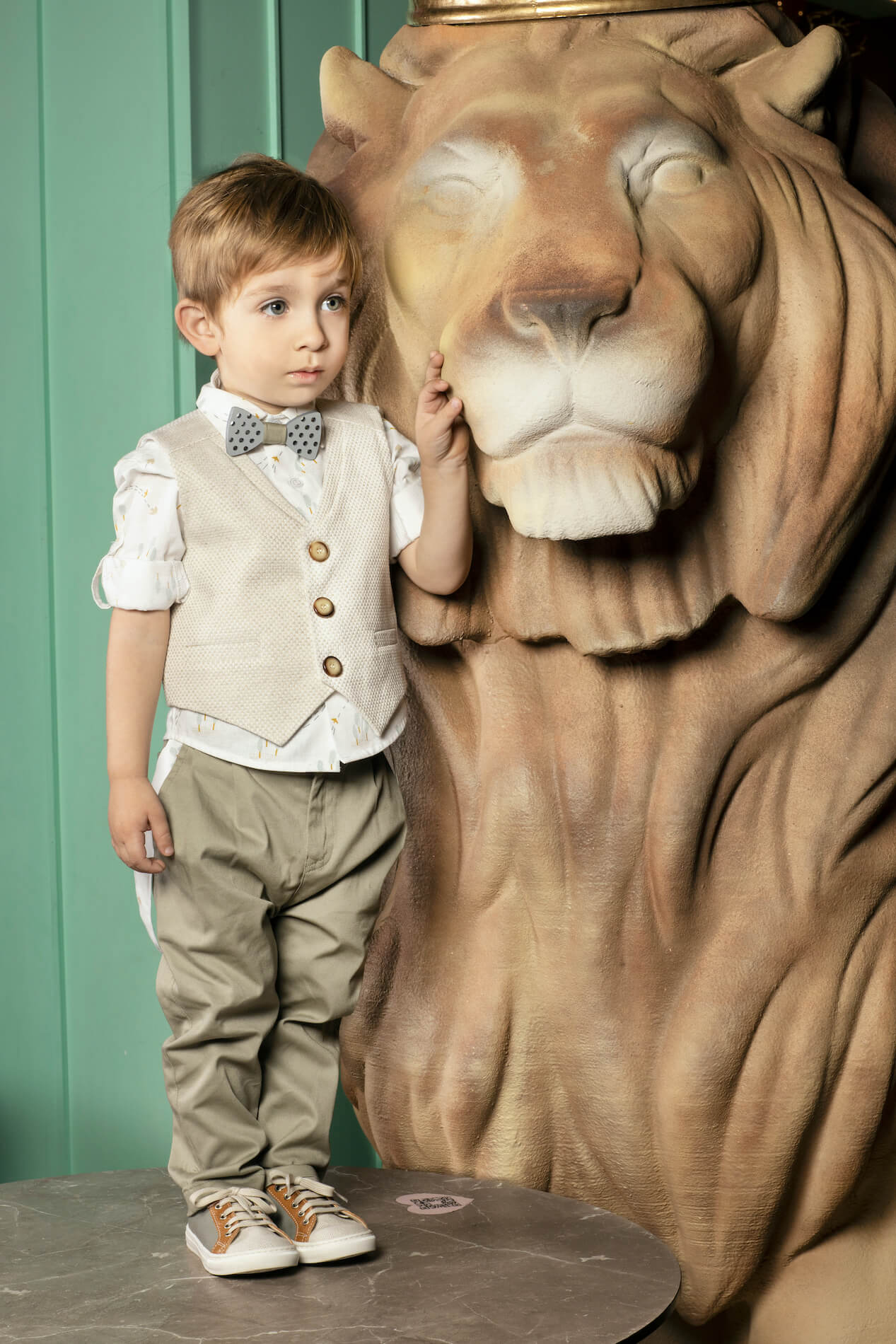 Εντυπωσιακό σύνολο από εξαιρετικής ποιότητας βαμβακερό πουκάμισο σε εκρού απόχρωση με δεντράκια συνδυασμένο με χακί βαμβακερό παντελόνι και λινό μπεζ γιλέκο. Πρόκειται για ένα σετ που θα κάνει ακόμη πιο ξεχωριστές τις εμφανίσεις του μικρού σας βασιλιά.