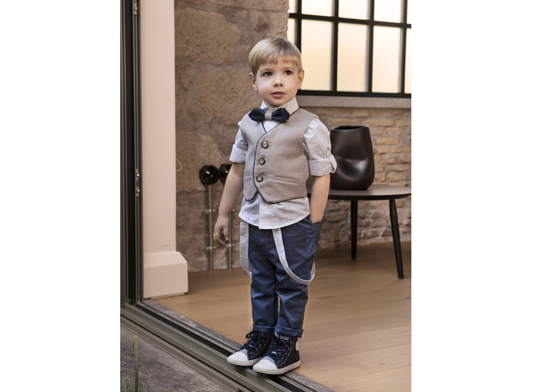 Υπέροχο σύνολο που περιλαμβάνει λευκό βαμβακερό πουκάμισο με σχέδιο από σιέλ σκηνές, μπεζ σκούρο γιλέκο σε ύφασμα καπαρντινέ και λεπτομέρειες με ρέλι σε μπεζ/ραφ χρώματα και παντελόνι ραφ. Πρόκειται για ένα σύνολο γεμάτο στυλ και κομψότητα που θα συνοδεύσει το μικρό σας στις πιο λαμπερές τους αναμνήσεις!