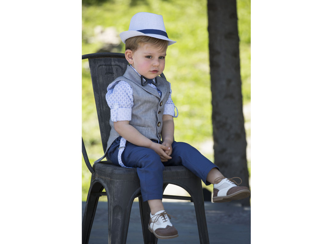 Ιταλικός αέρας σε ένα απλό σύνολο από μοναδικά υφάσματα. Ένα chic σύνολο για τους μικρούς σας πρίγκιπες, που αποτελείται από σιελ 100% βαμβακερό πουκάμισο με μικροσχέδια, βαμβακερό παντελόνι σε ραφ απόχρωση και 100% γκρι λινό γιλέκο σε στυλ φράκο.