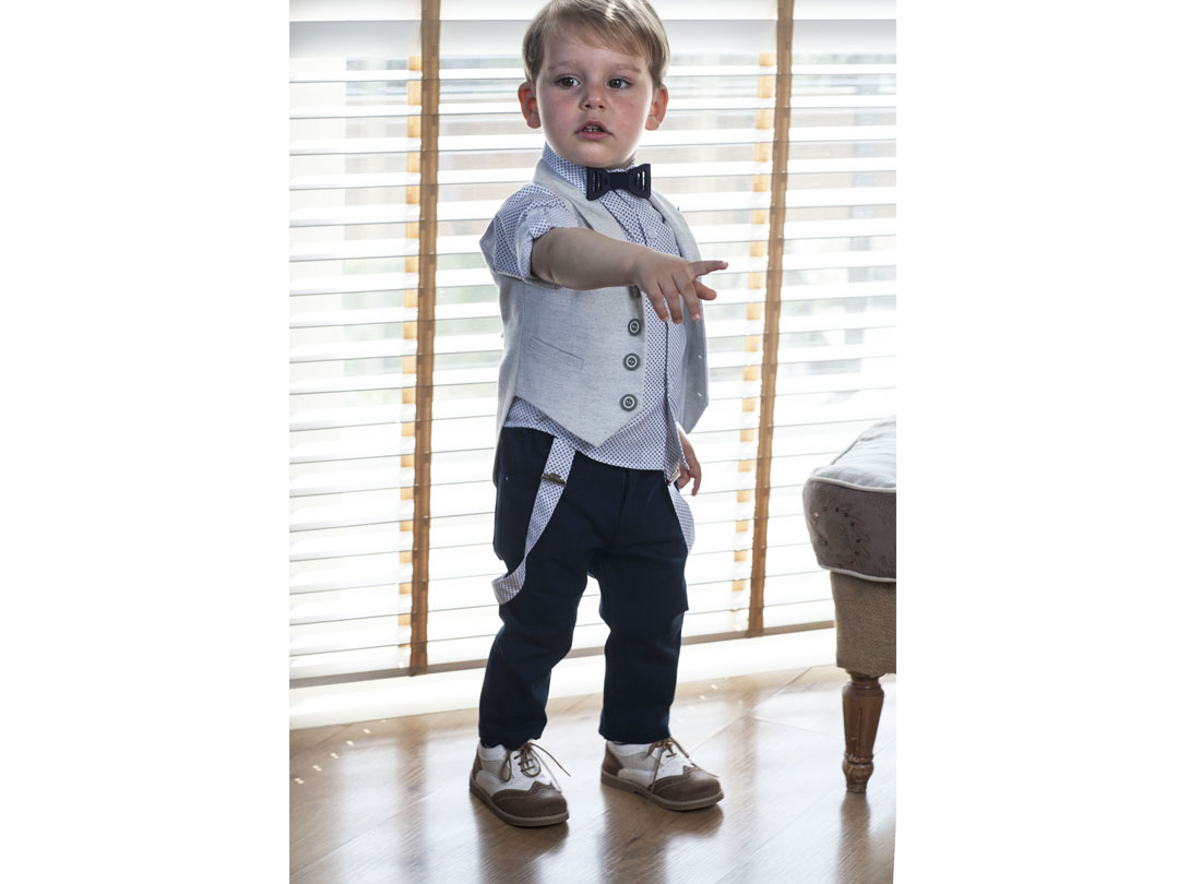Εντυπωσιακό σύνολο από εξαιρετικής ποιότητας υφάσματα. Το σετ αποτελείται από 100% βαμβακερό λευκό πουκάμισο διακοσμημένο με μικροσχέδια σε μπλε απόχρωση. Το σύνολο ολοκληρώνεται με το μπλε βαμβακερό παντελόνι, το οποίο είναι συνδιασμένο εξαιρετικά με το γκρι λινό γιλέκο σε “frako style”. Ένα μοναδικό σύνολο για τον μικρό σας πρίγκιπα.