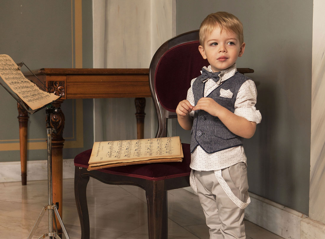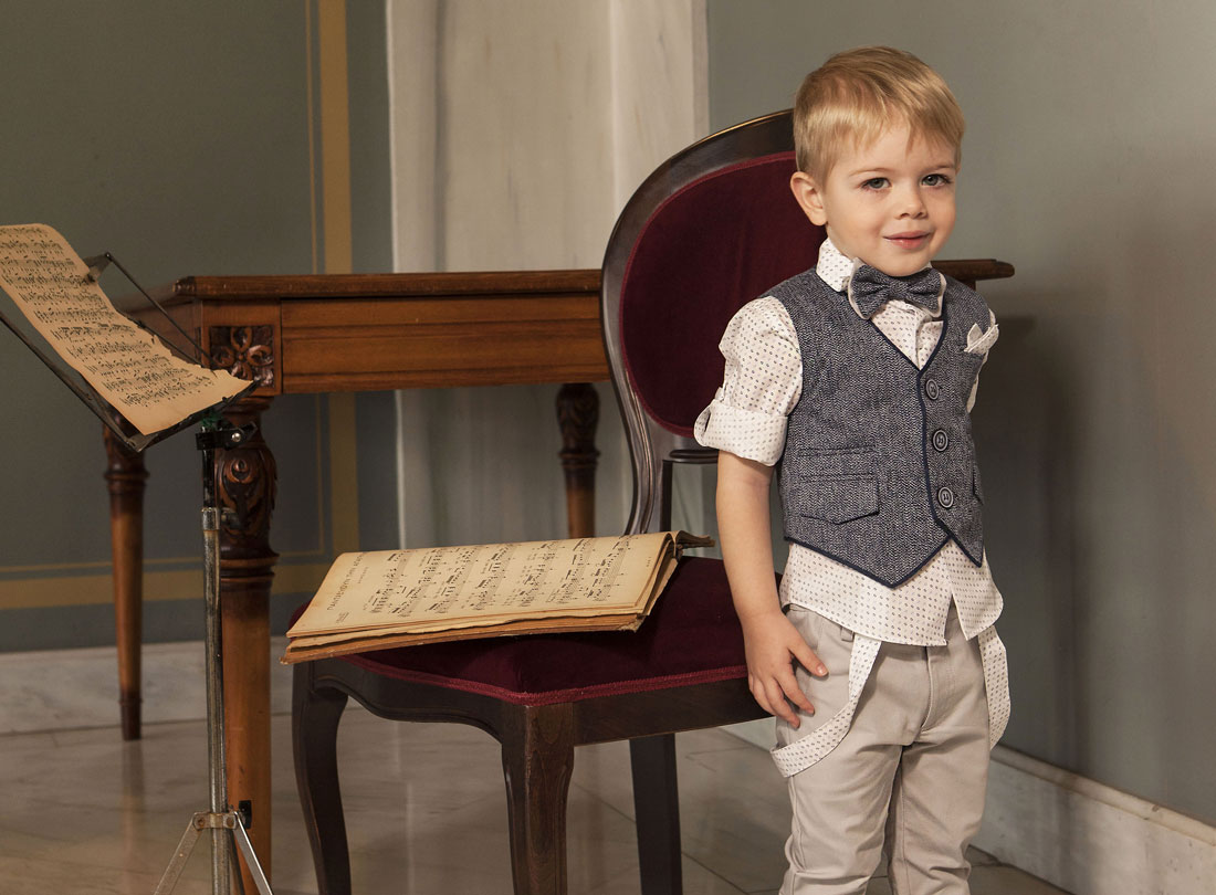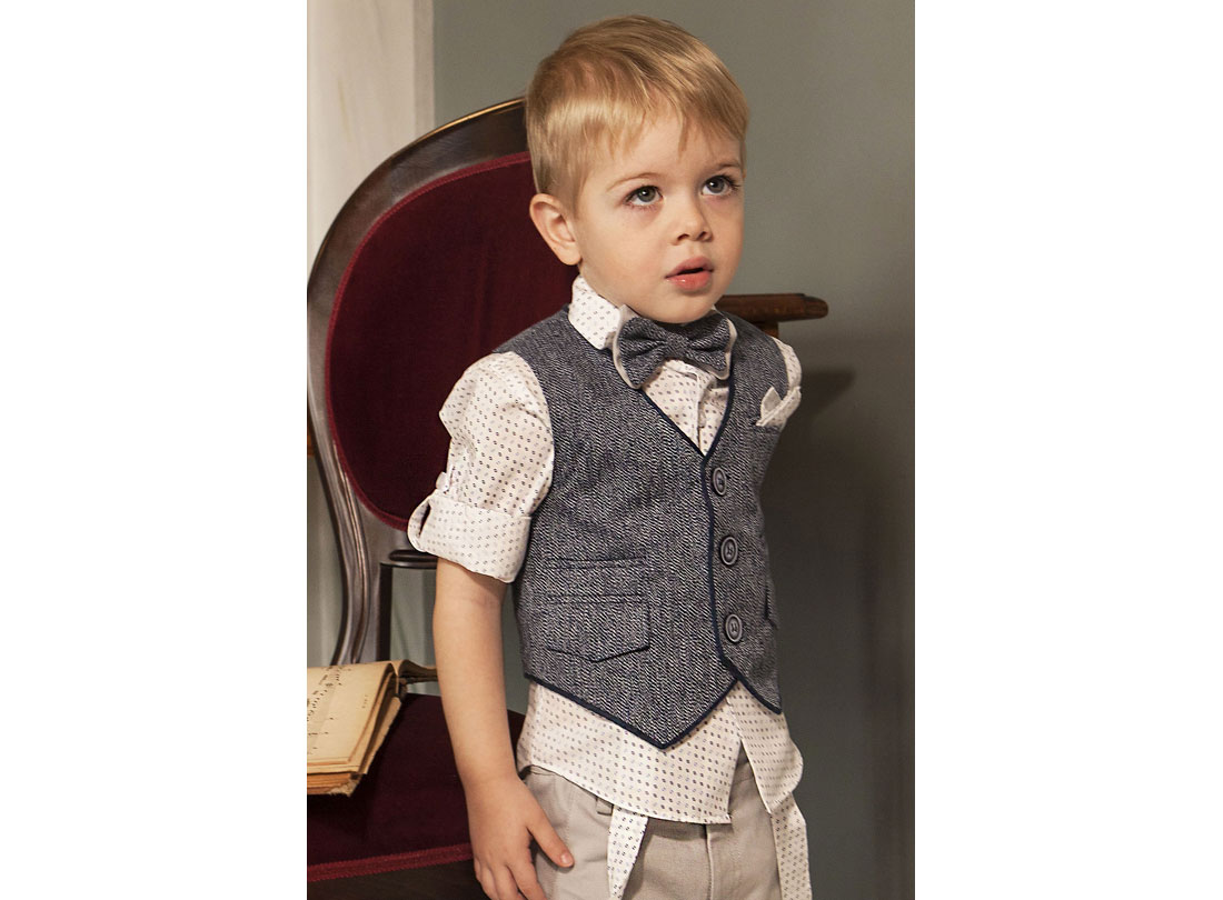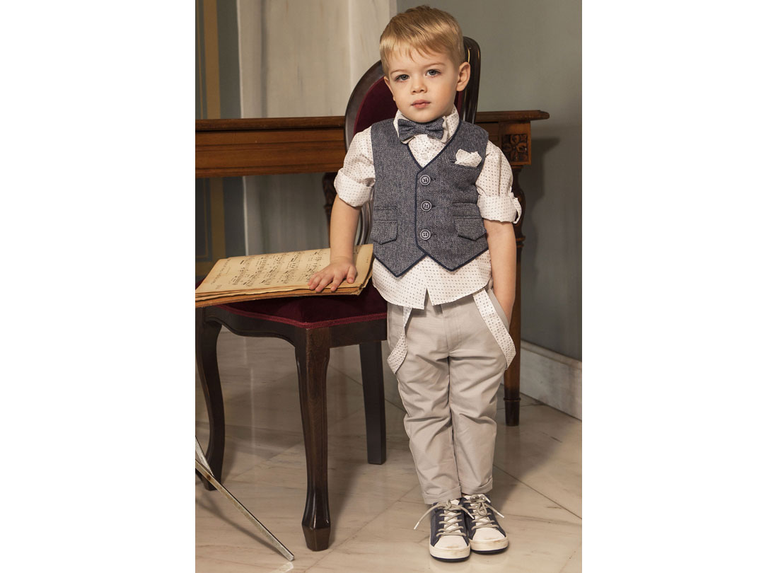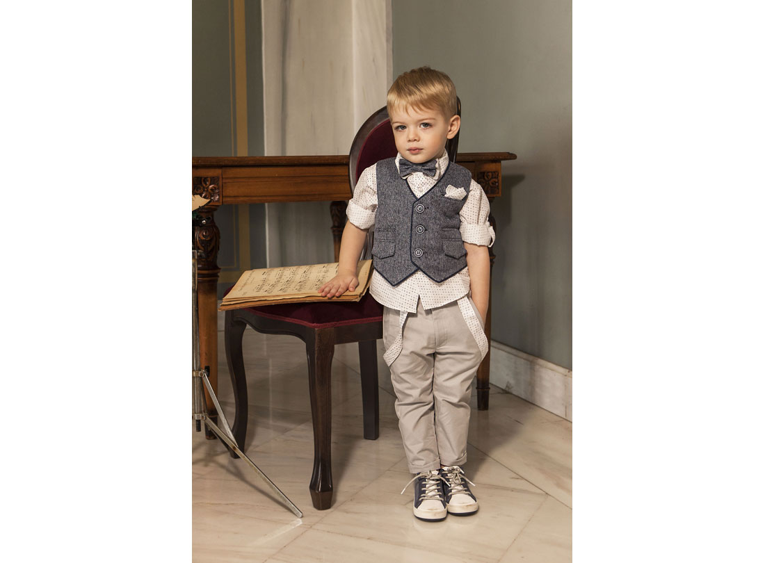 Σύνολο με εξαιρετικής ποιότητας υφάσματα . Το σύνολο αποτελείται από το λευκό 100% βαμβακερό πουκάμισο με μικροσχέδια σε σιελ /μπλε απόχρωση, ανοιχτό γκρι βαμβακερό παντελόνι και ολοκληρώνεται με το ανοιχτό μπλε λινό γιλέκο με τελείωμα μπλε ρέλι . Πρόκειται για ένα σετ που θα φορέσει το μικρό σας αστέρι στις πιο ξεχωριστές του στιγμές .