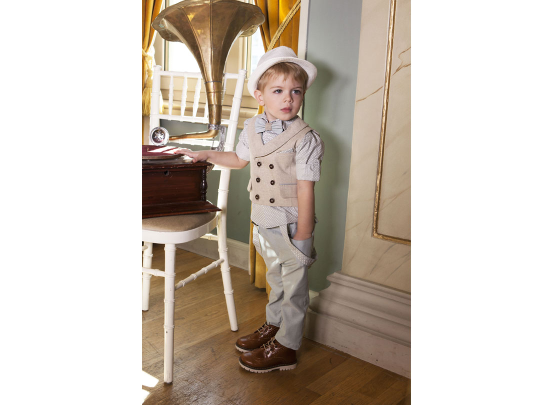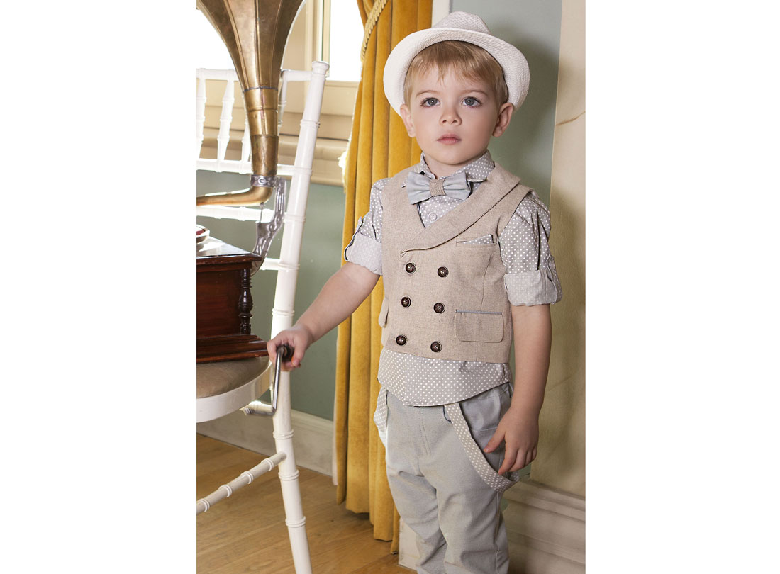 Ανάλαφρο και κομψό σύνολο για τις πιο ιδιαίτερες εμφανίσεις του μικρού σας πρίγκιπα. Το σετ αποτελείται από μέντα βαμβακερό πουκάμισο με σχέδιο εκρού πουά, συνδυασμένο με βαμβακερό παντελόνι σε απόχρωση μέντας. Το σύνολο ολοκληρώνει το μπεζ βαμβακερό γιλέκο με μέντα ρέλι .