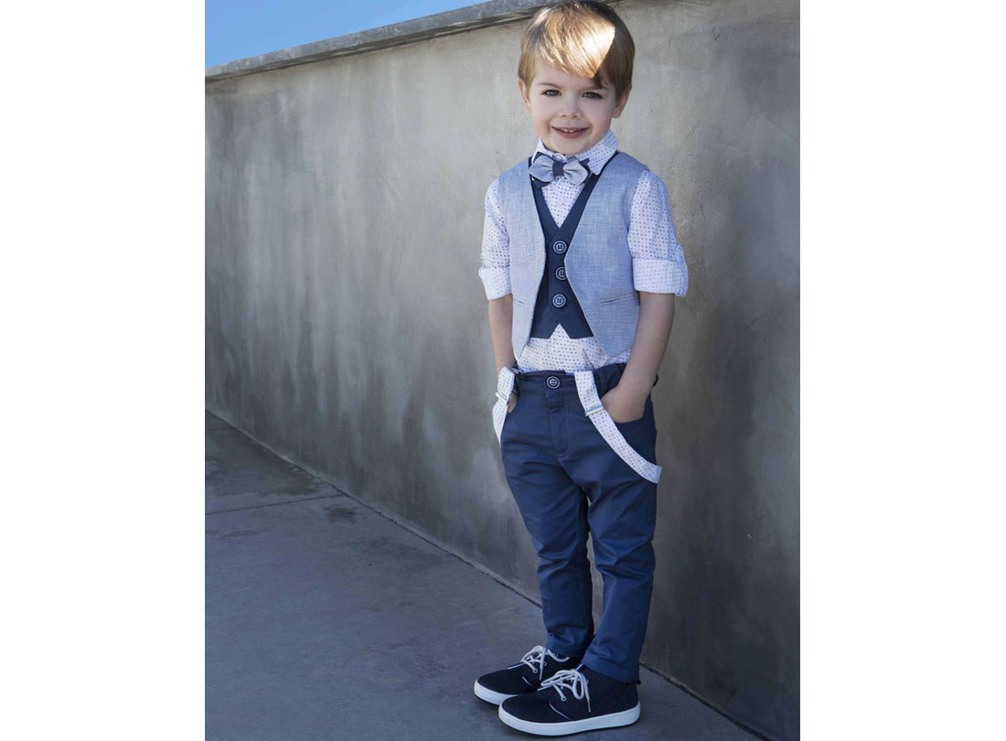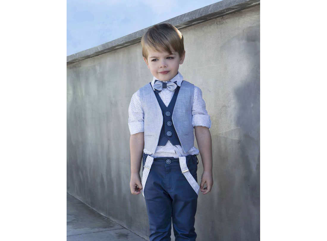 Υπέροχο σύνολο ιδανικά σχεδιασμένο για τις πιο όμορφες στιγμές του μικρού σας ήρωα. Το σύνολο αποτελείται από λευκό βαμβακερό πουκάμισο με μικροσχέδιο σιελ και μπλε, παντελόνι σε ραφ βαμβακερή καπαρντίνα και ολοκληρώνεται με διπλό γιλέκο σιελ λινό και το εσωτερικό του σε ραφ καπαρντίνα. Αξεσουάρ: συνοδεύεται απο παπιγιόν, τιράντες και ψάθινο καπέλο
