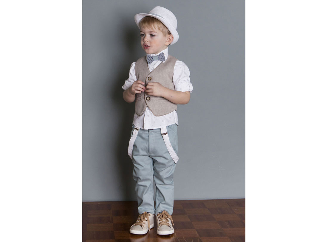 Κομψό και εντυπωσιακό σύνολο που αποτελείται από εξαιρετικής ποιότητας 100% βαμβακερό λευκό πουκάμισο με μικροσχέδια μπεζ αστεράκια. Το σετ δίνει έμφαση στην φινέτσα με το μέντα βαμβακερό παντελόνι και την υψηλή αισθητική με το μπεζ λινό γιλέκο κάνοντας κάθε εμφάνιση του μικρού σας ξεχωριστή.
