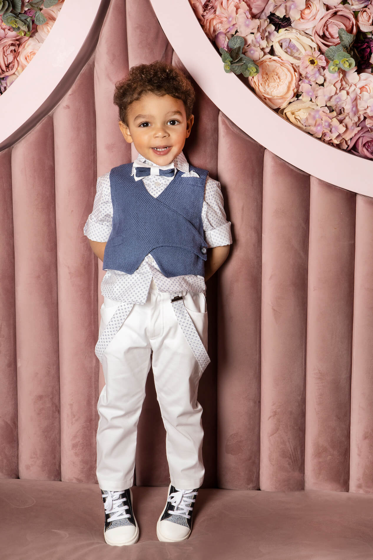 Μοναδικό σύνολο από υψηλής ποιότητας υφάσματα. Το σετ περιλαμβάνει βαμβακερό λευκό πουκάμισο με μπλε λουλούδι, συνδυασμένο με λευκό βαμβακερό παντελόνι και μπλε λινό γιλέκο με ιδιαίτερο πλαϊνό δέσιμο.