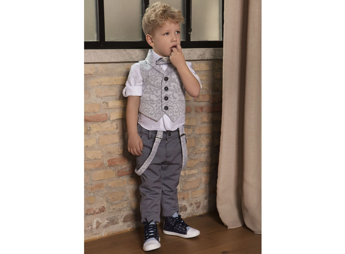 Εξαιρετικής αισθητικής σύνολο απο μοναδικά υφάσματα. Το σετ περιλαμβάνει 100% βαμβακερό πουκάμισο συνδυασμένο αρμονικά και κομψά με γκρι παντελόνι και ασορτί γκρι ζακάρ γιλέκο σε “frako style”. Πρόκειται για ένα μοναδικό σύνολο που θα κάνει τον μικρό σας πρίγκιπα να λάμψει ακόμη περισσότερο.