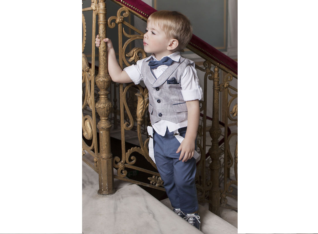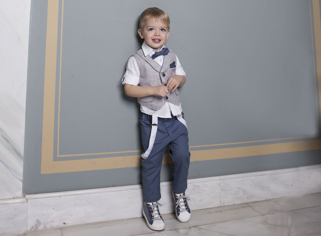 Εντυπωσιακό σύνολο από εξαιρετικής ποιότητας υφάσματα. Το σετ αποτελείται από 100% βαμβακερό λευκό πουκάμισο και ραφ βαμβακερό παντελόνι. Το σύνολο ολοκληρώνεται με το γκρι λινό γιλέκο με ρέλι ραφ απόχρωση. Ένα μοναδικό σύνολο για το μικρό σας αστέρι.