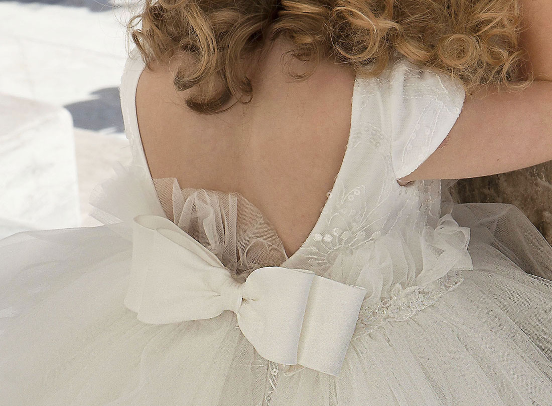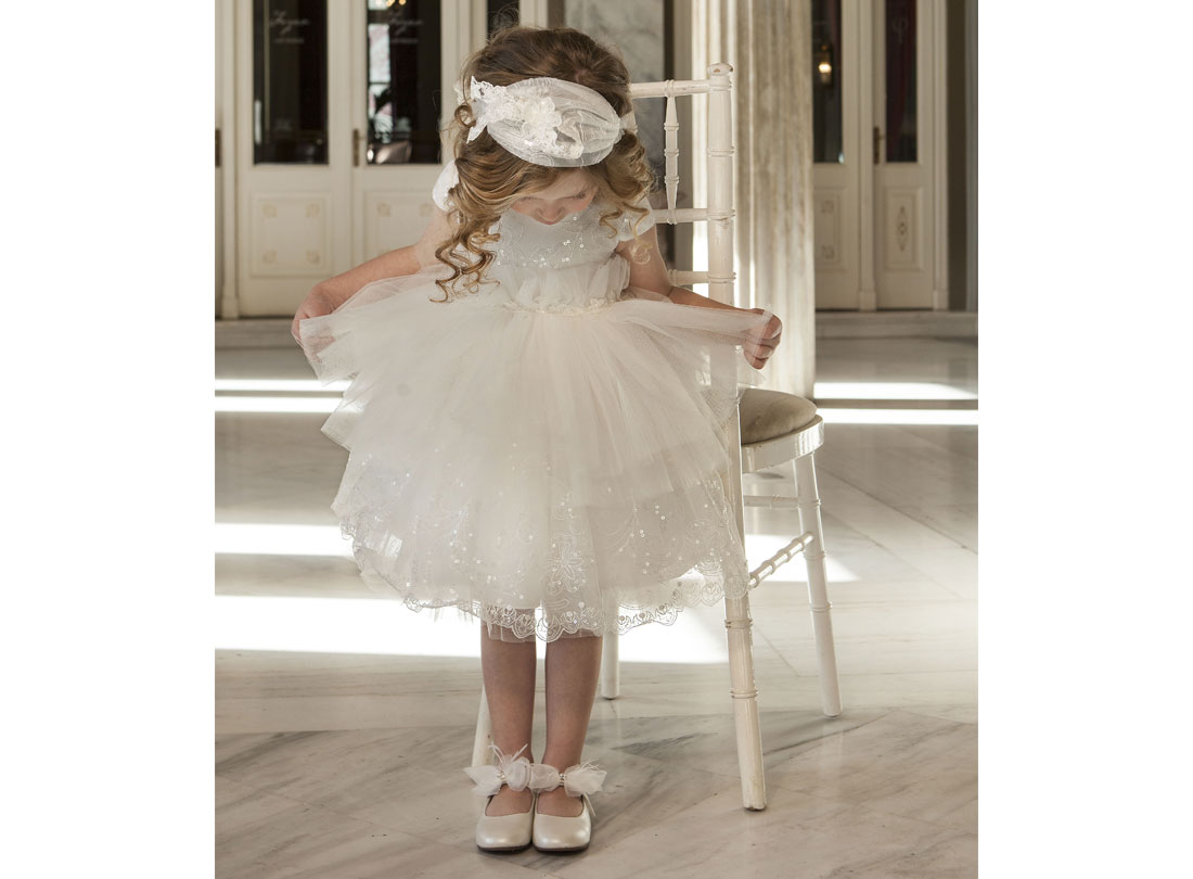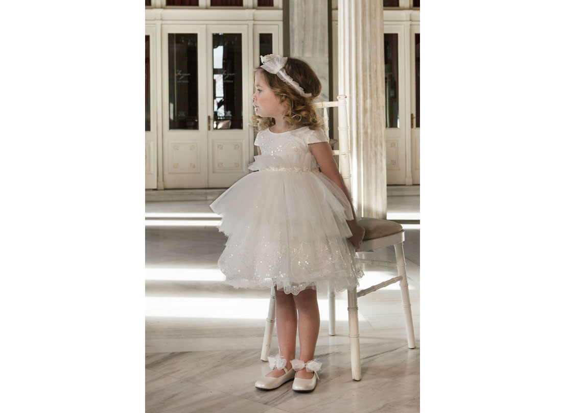 Πριγκιπικό φόρεμα με μανίκι ,από υψηλής ποιότητας δαντέλα με παγιέτες. Το φόρεμα έχει μια ιδιαίτερη αποσπόμενη κοντή φούστα που το κάνει να έχει την δυνατότητα των δύο εμφανίσεων. Στη μέση του φορέματος έχει απλικαριστεί μια ζώνη από δαντέλα κεντημένη με παγιέτες. Στην πλάτη του φορέματος ένας αποσπόμενος σατέν φιόγκος τελειοποιεί το φόρεμα υψηλής ραπτικής. Είναι σχεδιασμένο για τις πιο όμορφες στιγμές της μικρής σας πριγκίπισσας. Το εσωτερικό του φορέματος είναι επενδυμένο με 100% βαμβακερή φόδρα.