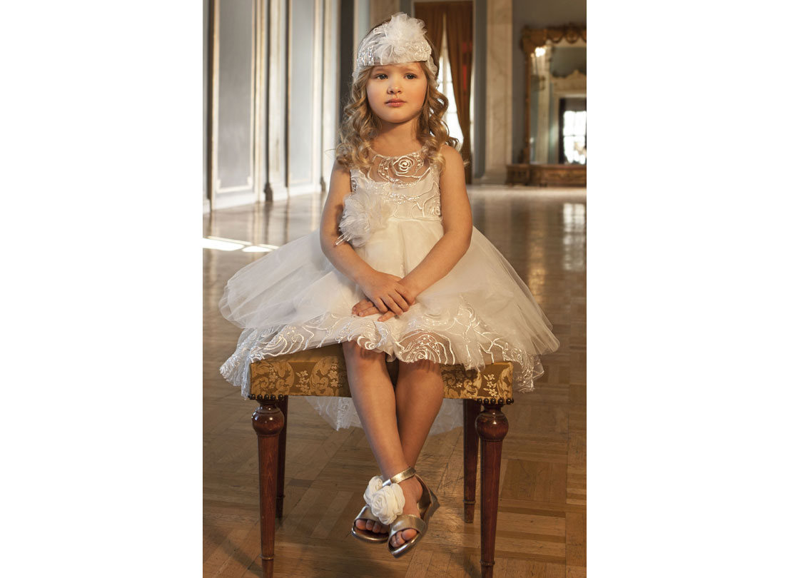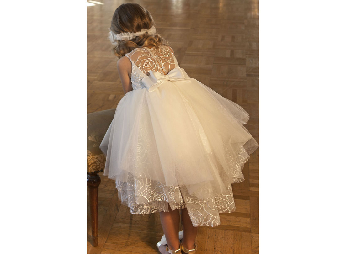 Φόρεμα μοναδικού design από τούλι εξαιρετικής ποιότητας . Το μπούστο αποτελείται απο κεντητή λουλουδάτη δαντέλα με παγιέτες για ακόμη περισσότερη λάμψη της μικρής σας νεράϊδας. Η φούστα είναι άνιση με πιο κοντό μήκος στο μπροστά μέρος και μακρύτερο στο πίσω μέρος. Το εσωτερικό είναι επενδυμένο από 100% βαμβακερή φόδρα.