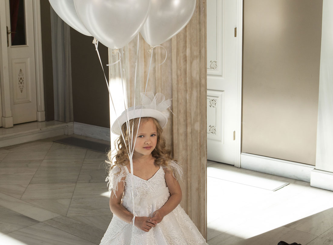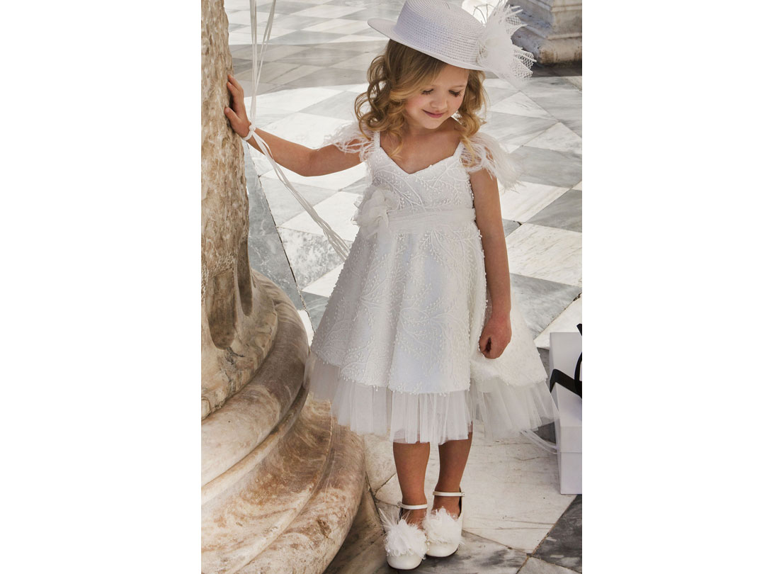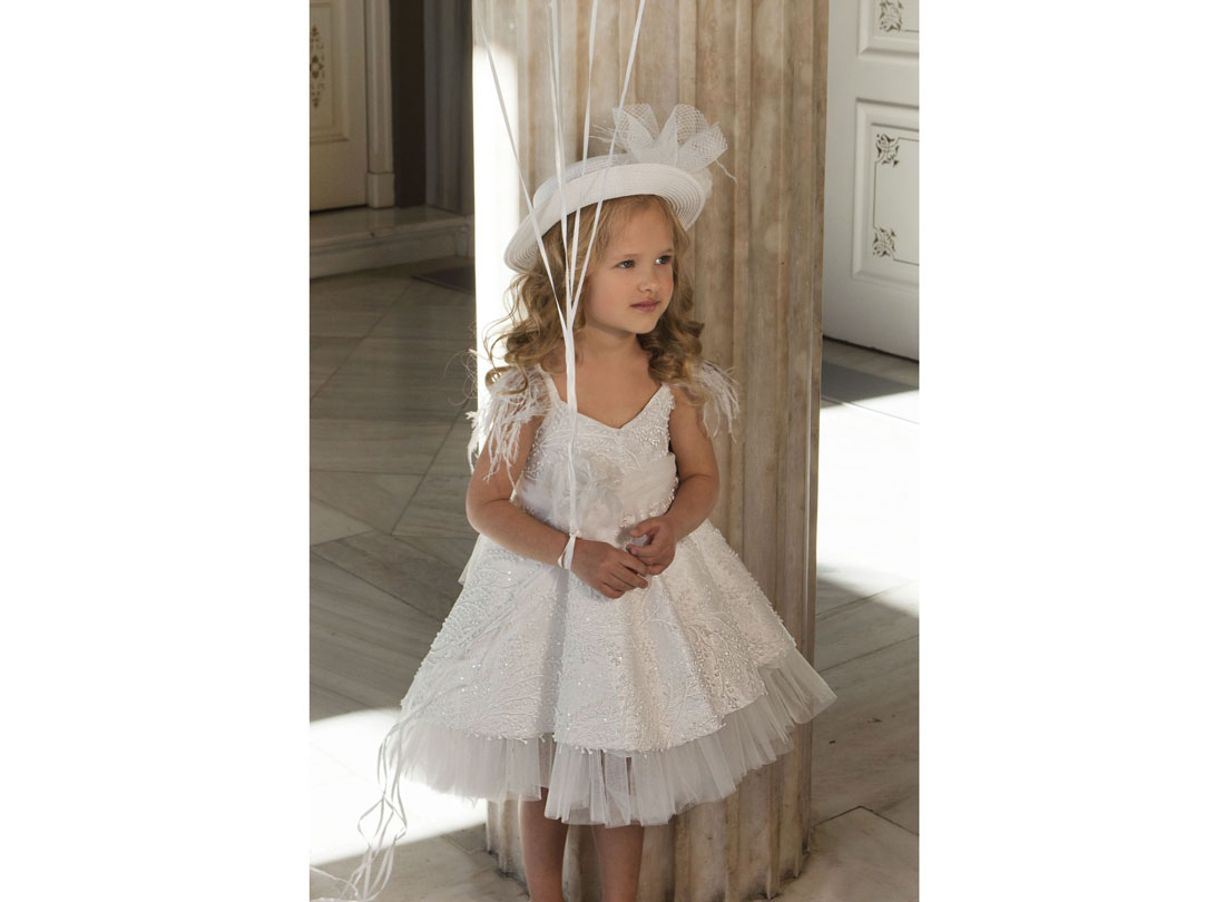 Ρομαντικό ασύμετρο φόρεμα από λουλουδάτη δαντέλα με παγιέτες. Διακοσμημένο στη μέση με χειροποίητο λουλούδι και τούλινη ζώνη. Τα πούπουλα στα μανίκια προσδίδουν μια εκλεπτυσμένη αίσθηση, ιδανική για τις πιο ιδιαίτερες στιγμές της μικρής σας. Το εσωτερικό του φορέματος είναι επενδεδυμένο με φόδρα 100% βαμβακερή.