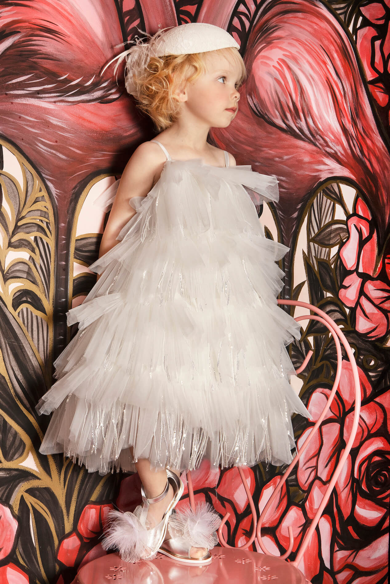 Ιδιαίτερο φόρεμα από φίνο τούλι με εντυπωσιακές παγιέτες που δημιουργεί μοναδική αίσθηση. Το φόρεμα είναι σε γραμμή άλφα με πολλαπλά επίπεδα από βολάν. Πρόκειται για ένα φόρεμα υψηλής ραπτικής. Το εσωτερικό του είναι επενδυμένο με φόδρα 100% βαμβακερή.