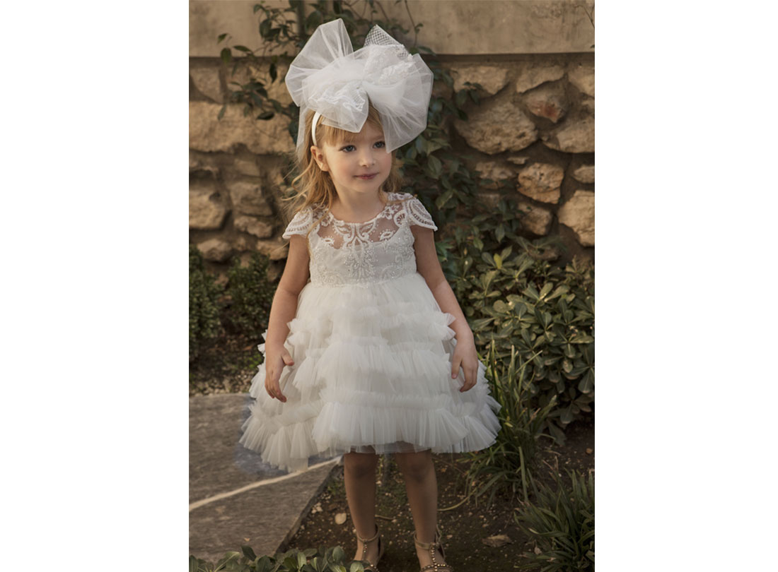 Φόρεμα μοναδικού design απο τούλι εξαιρετικής ποιότητας που δημιουργεί ιδιαίτερα βολάν.Το μπούστο αποτελείται απο γαλλική δαντέλα διακοσμημένη με γλίτερ για ακόμηπερισσότερη λάμψη της μικρής σας νεράϊδας. Η φούστα είναι άνιση με πιο κοντό μήκος στο μπροστά μέρος. Το εσωτερικό είναι επενδεδυμένο απο100% βαμβακερή φόδρα.