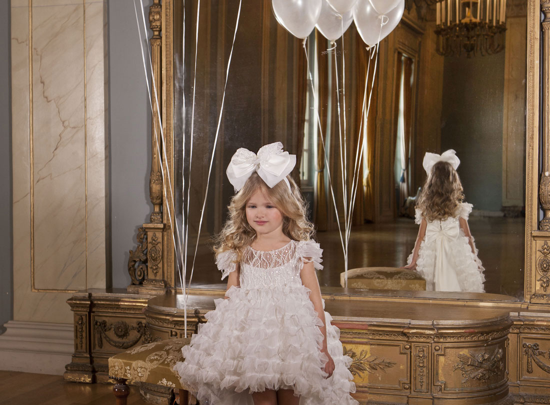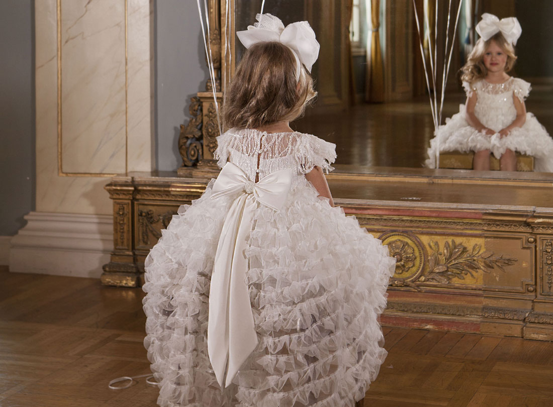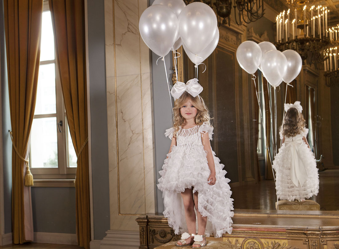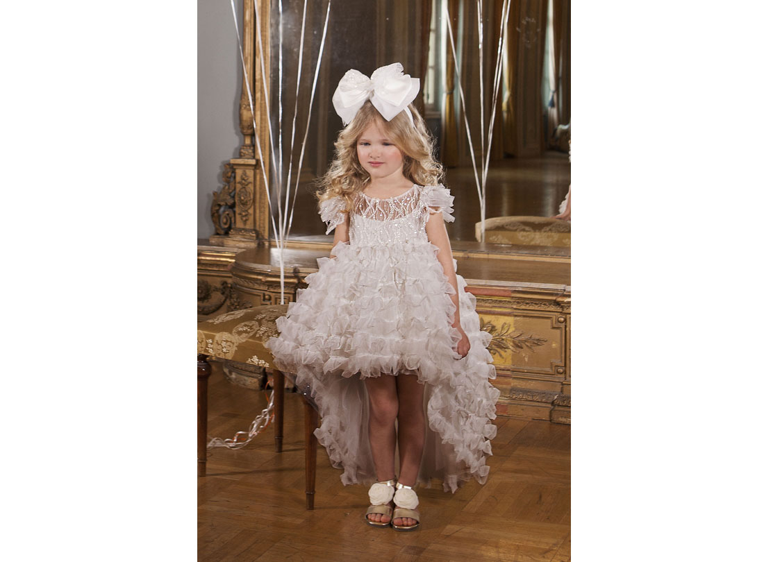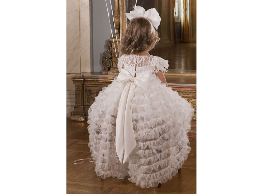 Εντυπωσιακό άνισο φόρεμα με μακριά ουρά. Το ιδιαίτερο τούλινο βολάν δημιουργεί μια μοναδική αίσθηση για την μικρή σας πριγκίπισσα. Το επάνω μέρος με κεντητή δαντέλα με κρύσταλλα και ασορτί μανίκι με εκλεπτυσμένη αίσθηση. Στο πίσω μέρος δένει με ένας μοναδικός σατέν φιόγκος που αποσπάται και ολοκληρώνει το αριστοκρατικό φόρεμα. Το εσωτερικό του είναι επενδυμένο με φόδρα 100% βαμβακερή.