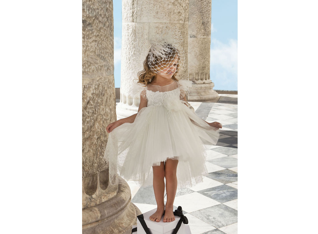 Υπέροχο ασύμετρο φόρεμα απο τούλι υψηλής ποιότητας. Διακοσμημένο με κεντημένη λουλουδάτη δαντέλα που δημιουργεί διαφάνεια στο επάνω μέρος με μανίκια στολισμένα με πούπουλα. Το φόρεμα συμπληρώνεται από χειροποίητο λουλούδι στο κορσάζ και ασορτί φιόγκο στο πίσω μέρος. Πρόκειται για ένα φόρεμα υψηλής ραπτικής και για ειδικές περιστάσεις. Το εσωτερικό του είναι επενδυμένο με 100% βαμβακερή φόδρα.