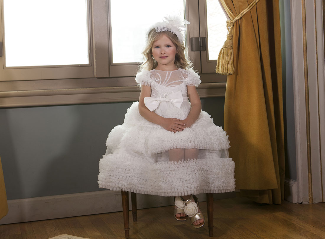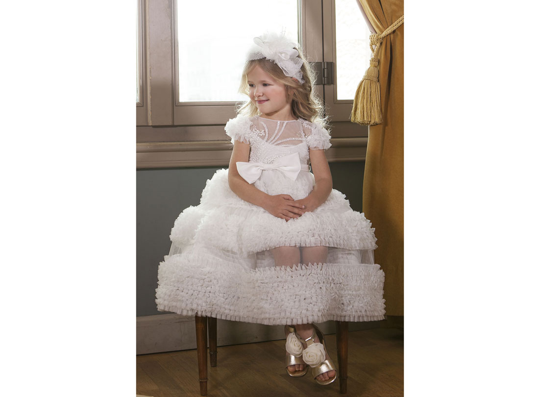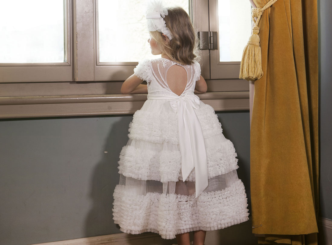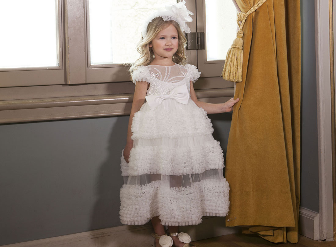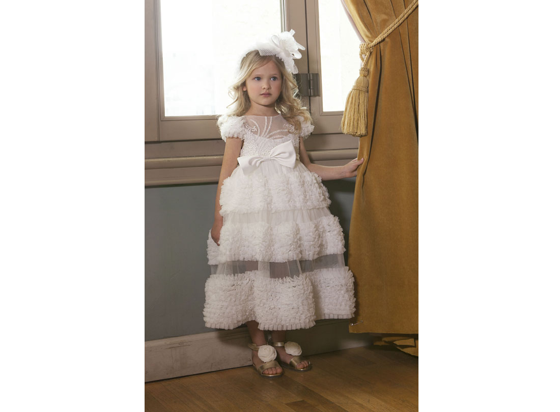 Κομψό μάξι φόρεμα σχεδιασμένο για τις πιο σημαντικές στιγμές της μικρής σας. Το επάνω μέρος του φορέματος αποτελείται από γαλλική δαντέλα κεντητή με πέρλες και παγιέτες. Κατά μήκος του φορέματος αναπτύσσονται μοναδικά μοτίβα από τούλινα βολάν και δημιουργείται ανάμεσα τους μια διαφάνεια. Στο πίσω μέρος του φορέματος υπάρχει ενα ιδιαίτερο άνοιγμα στην πλάτη και συνδυάζεται με ένα διπλός φίογκος από μαλακό σατέν στη μέση. Το εσωτερικό του φορέματος είναι επενδυμένο με 100% βαμβακερή φόδρα.
