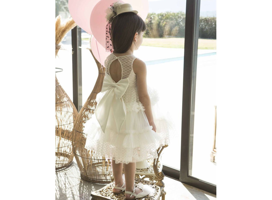 Εντυπωσιακό φόρεμα απο εξαιρετικής ποιότητας κεντητό τούλι με παγιέτες με βολάν που δημιουργεί πριγκιπική αίσθηση. Το μπούστο είναι κεντημένο με πέρλες και παγιέτες. Στο πίσω μέρος του φορέματος η διάφανη κεντημένη πλάτη με πέρλες μαζί με τον σατέν αποσπόμενο φιόγκο, ολοκληρώνει την αριστροκρατική όψη του φορέματος. Ιδανικό για τις πιο ξεχωριστές εμφανίσεις της της μικρής σας πριγκιπισσάς. Το εσωτερικό είναι επενδυμένο με 100% βαμβακερή φόδρα. Χρώματα:Ιβουάρ Αξεσουάρ: ασορτί χειροποιήτη κορδέλα