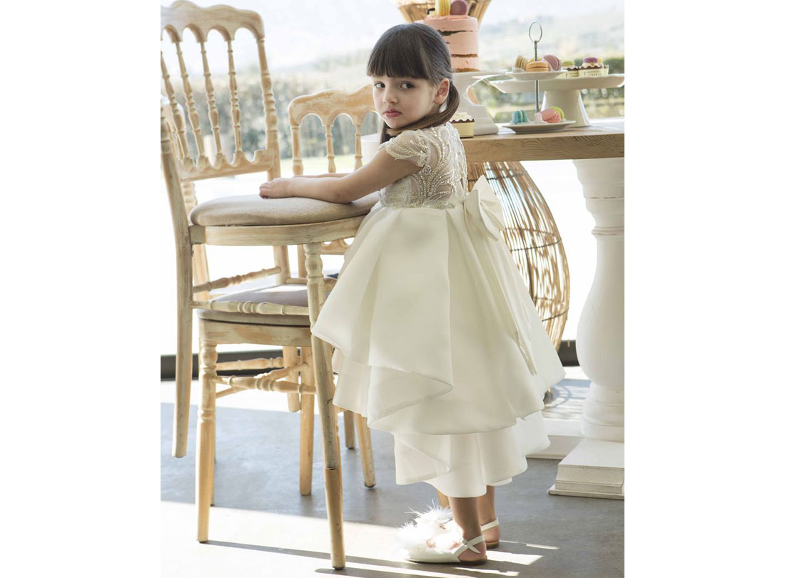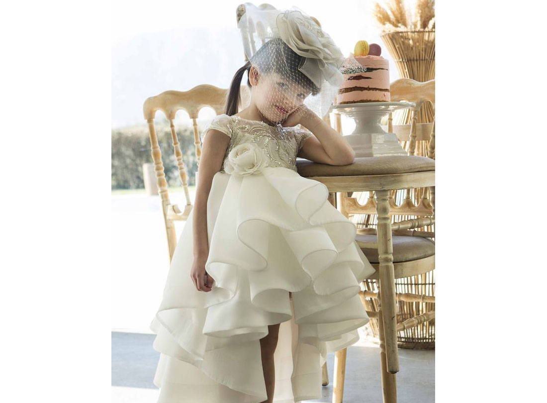 Υπέροχο ασύμετρο φόρεμα με μανίκια από οργάντζα υψηλής ποιότητας. Το φόρεμα είναι διακοσμημένο με κεντημένη ασημένια δαντέλα. Συμπληρώνεται από έναν μακρύ σατέν φιόγκο στο πίσω μέρος δημιουργώντας ένα φόρεμα υψηλής ραπτικής και ειδικών περιστάσεων. Το εσωτερικό του είναι επενδυμένο με 100% βαμβακερή φόδρα. Χρώματα: Ιβουάρ Αξεσουάρ: ασορτί χειροποίητη στέκα